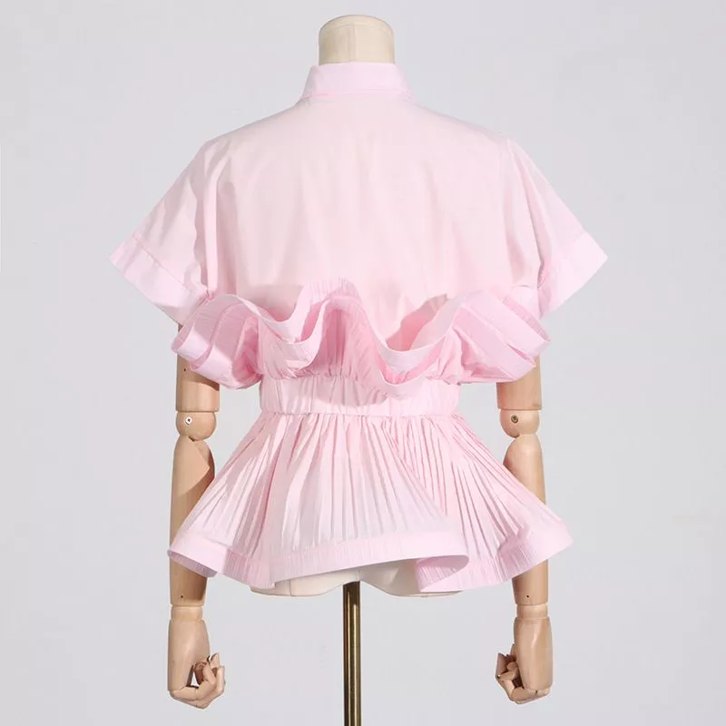 Camicia corta in tessuto leggero con taglio slim e vita arricciata che valorizza la figura. Le maniche ampie e il dettaglio con volant donano movimento e un effetto elegante ma moderno.