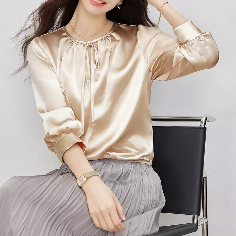 Camicia Satinata Donna Oro Champagne Elegante Ufficio Con Fiocco CF66258