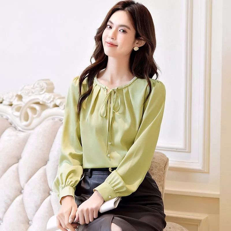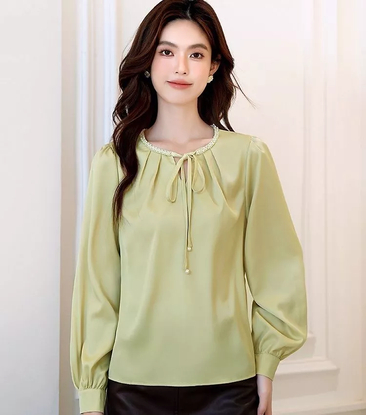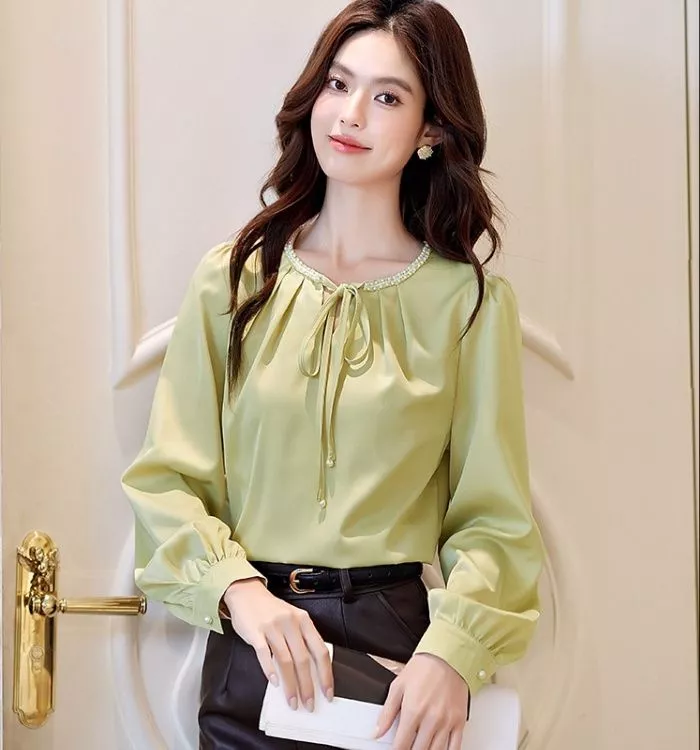 Camicia Satinata Verde Chiaro Con Fiocco E Perline Elegante Per Ufficio CF55935