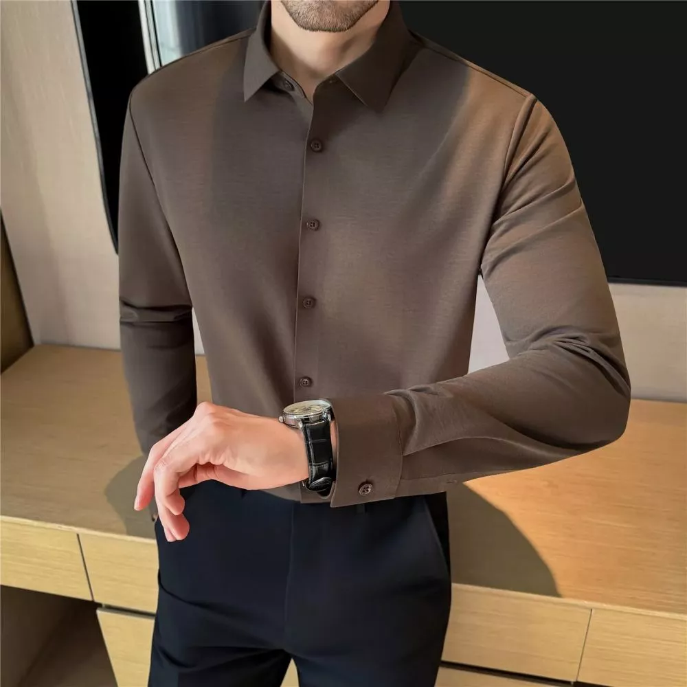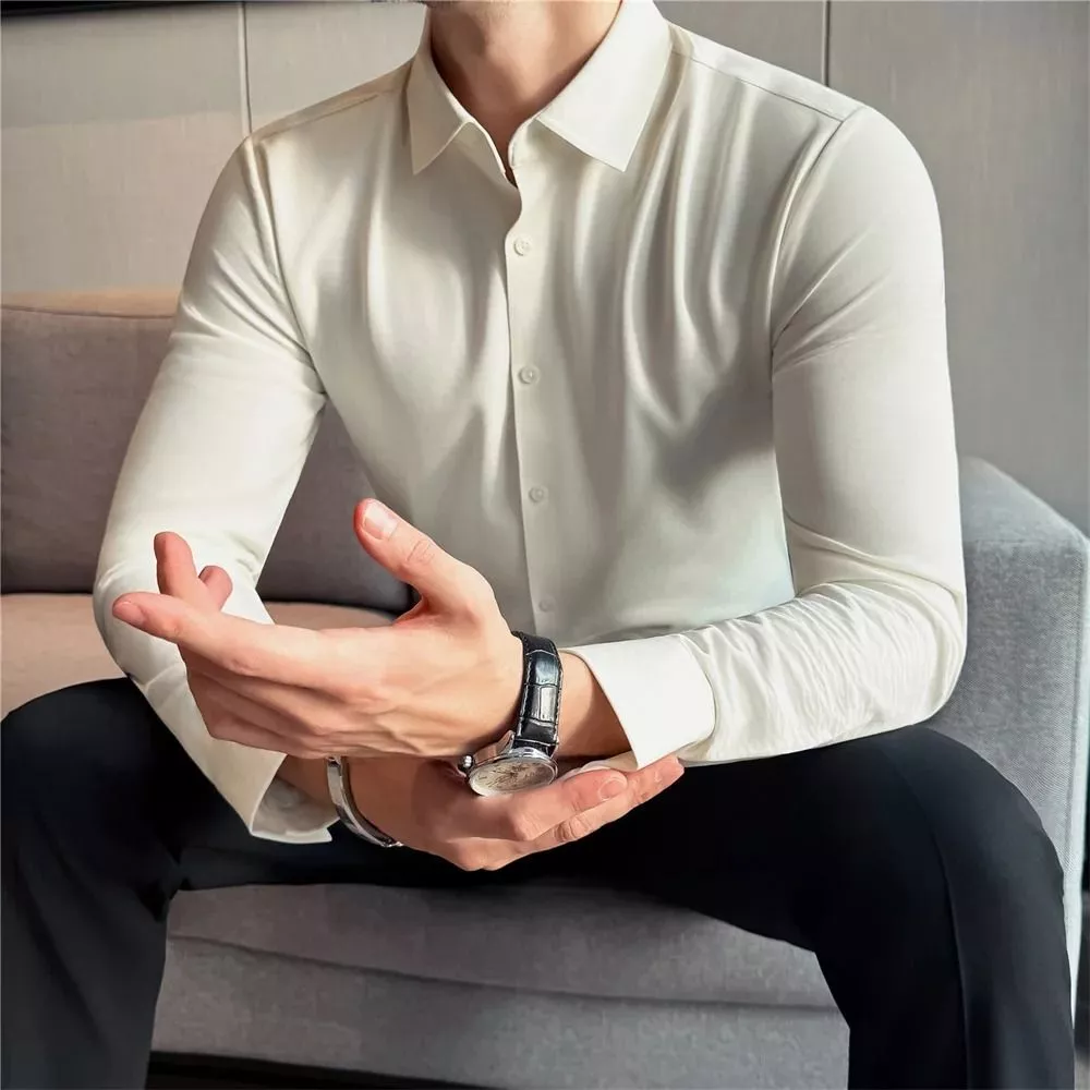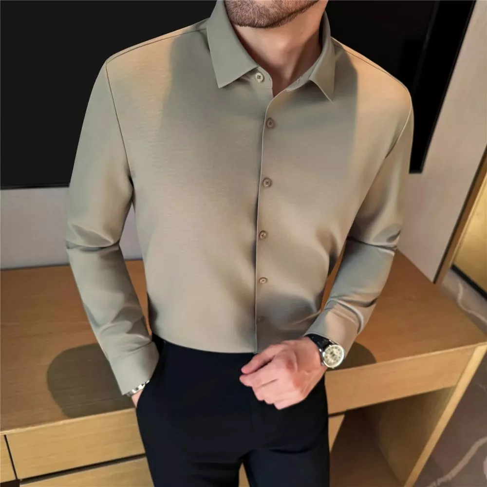 Camicia uomo dal design essenziale e raffinato, caratterizzata da linea pulita, taglio slim e stile minimal di ispirazione sartoriale. Il fit asciutto e il look pulito la rendono ideale per outfit business, occasioni eleganti o look serali sofisticati.