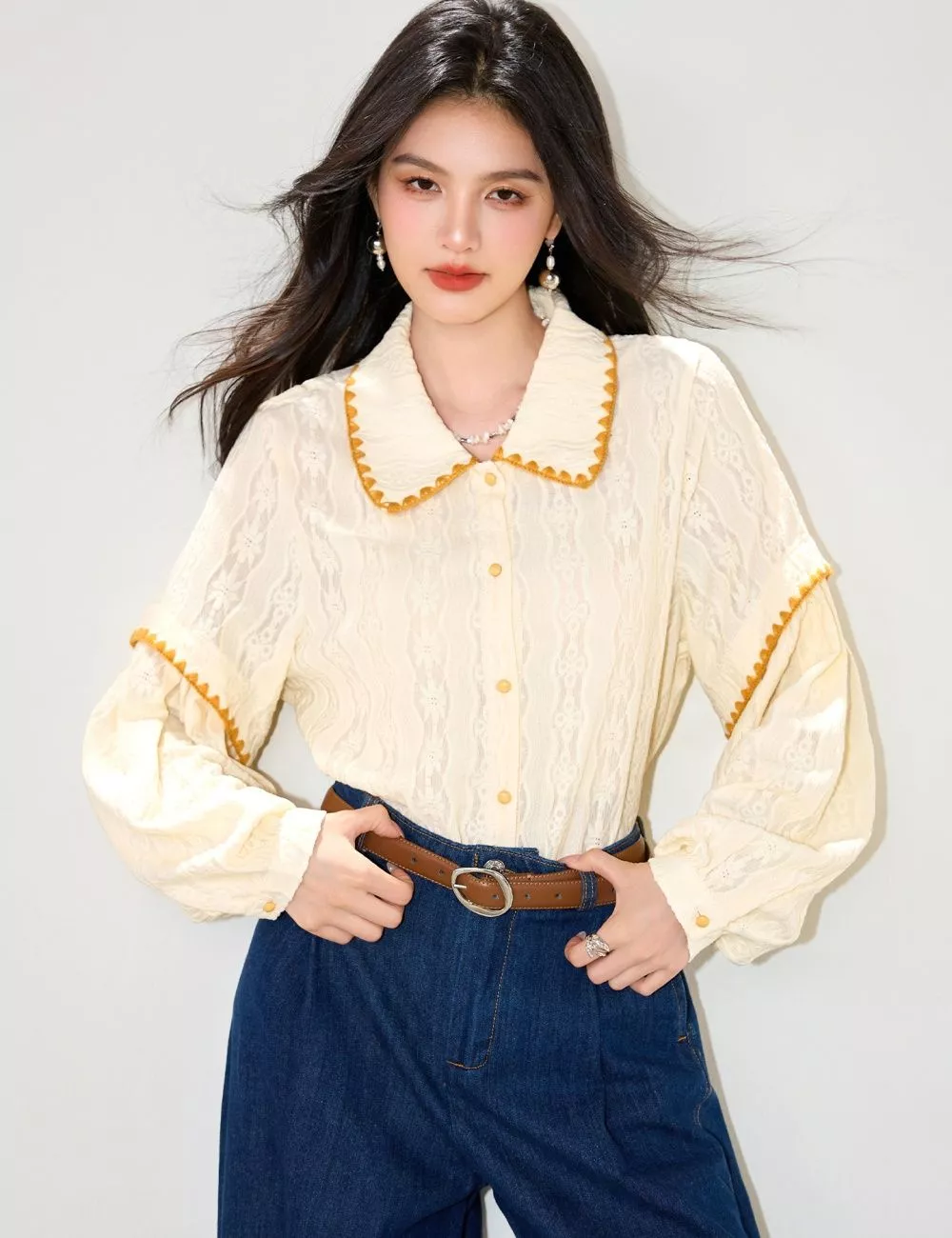 Camicia Gialla Donna Colletto Ricamato E Dettagli Decorativi Elegante CF57482