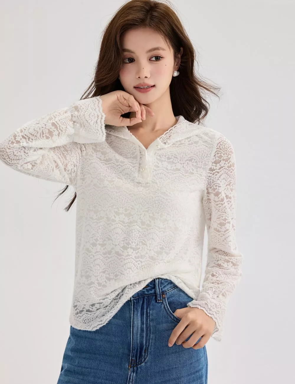 Maglia Bianca In Pizzo Donna Elegante Con Maniche Lunghe E Bottoncini CF57543