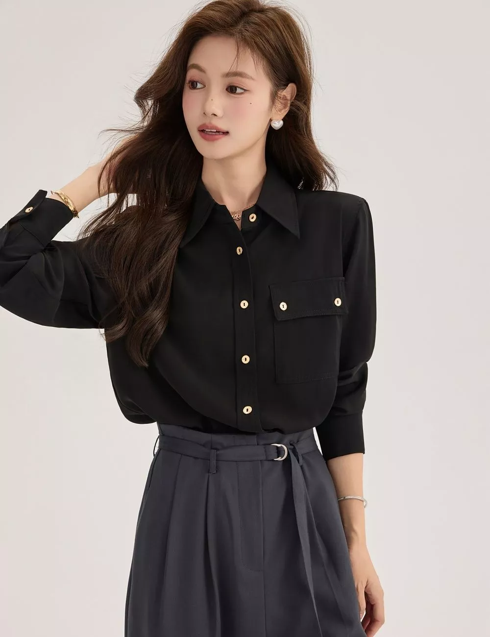 Camicia Nera Donna Elegante Raso Con Bottoni Dorati E Taschino Frontale CF57545