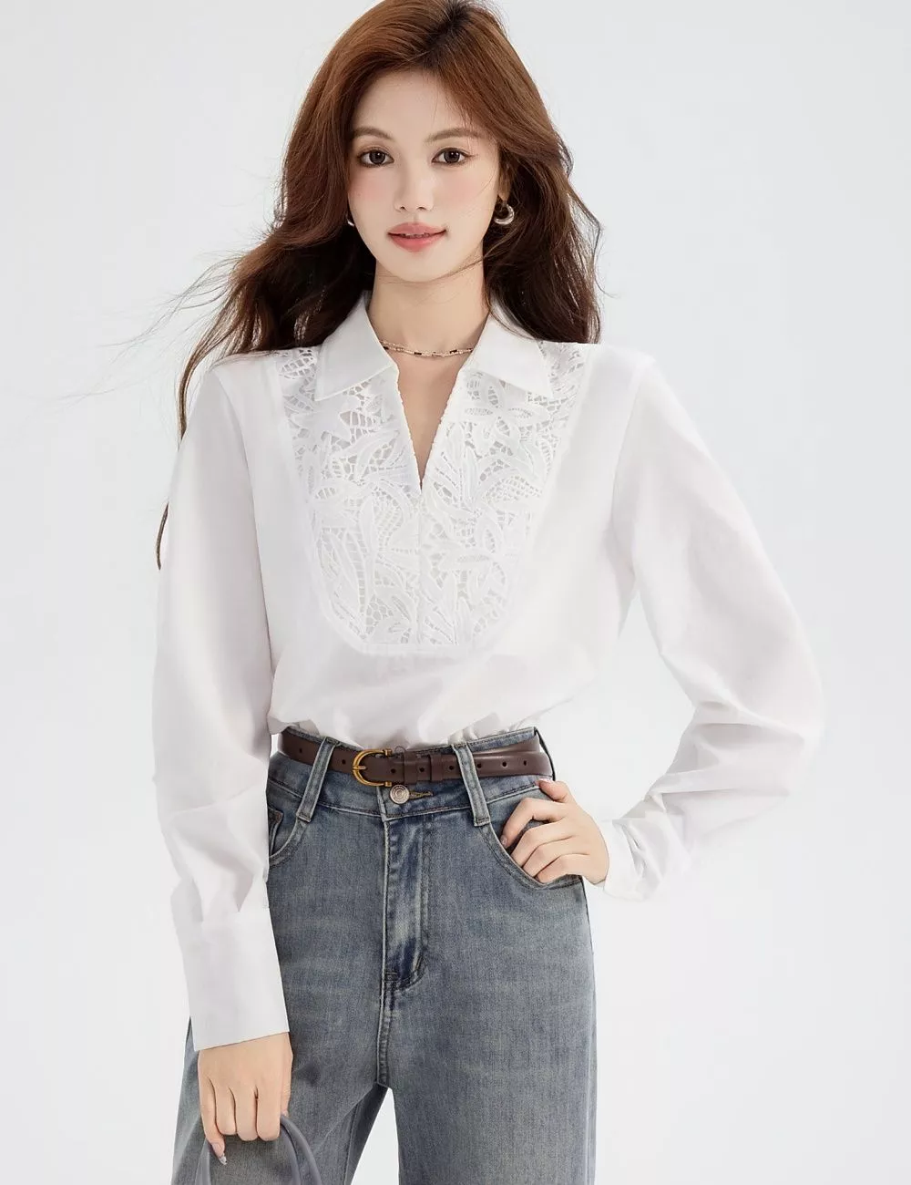 Camicia Bianca Donna Elegante Con Dettaglio In Pizzo E Colletto Classico CF57546