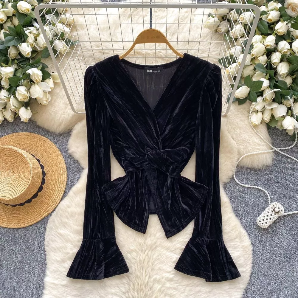Maglia Velluto Elegante Nodo Centrale Maniche A Tromba Oro Vintage Chic CF60337