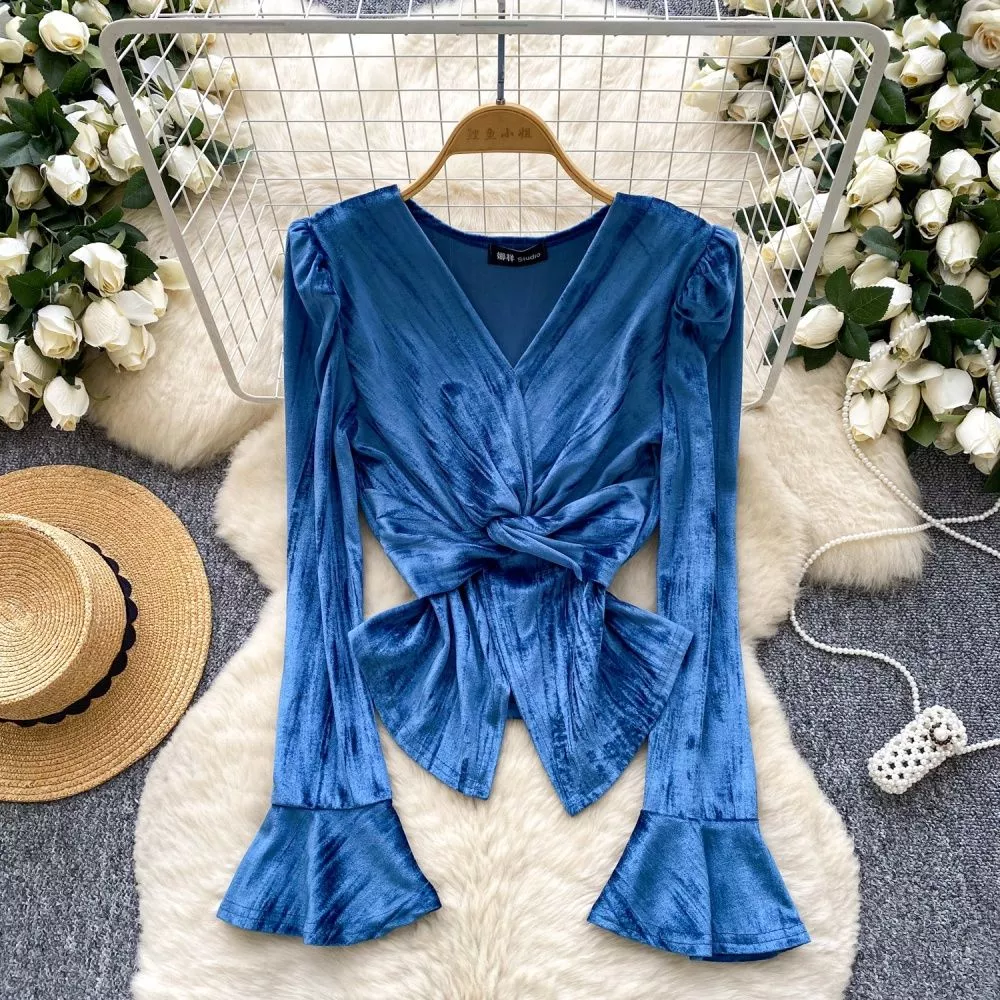 Maglia Velluto Elegante Nodo Centrale Maniche A Tromba Blu Stile Sera CF60337