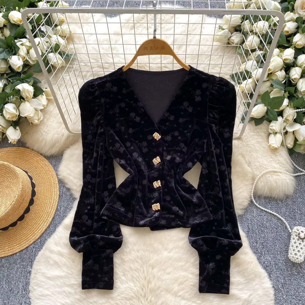 Blusa In Velluto Nero Con Bottoni Gioiello Look Elegante Per Sera CF60417