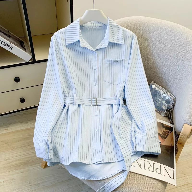 Camicia Donna Azzurra Righe Con Cintura Look Elegante Ufficio Moda CF66534