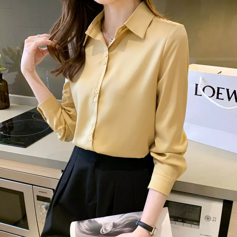 Camicia Donna Gialla Satinata Elegante Manica Lunga Chic CF67968
