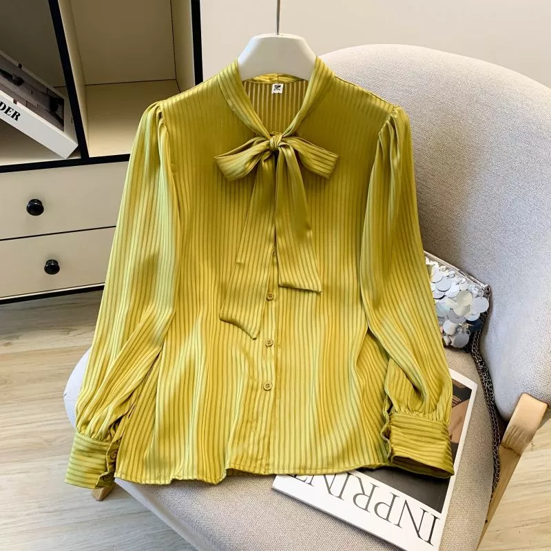 Blusa Donna Giallo Verde Satinata Con Fiocco Elegante Ufficio CF68050