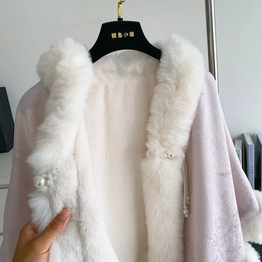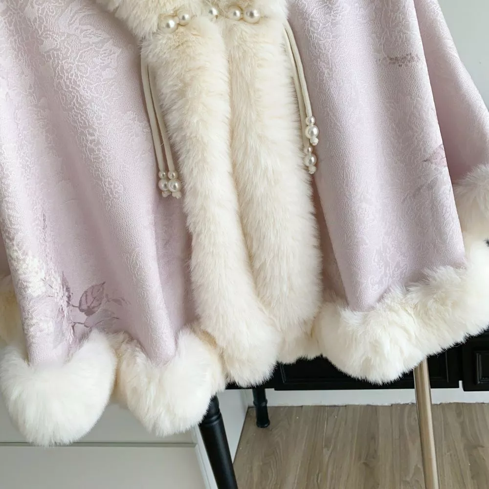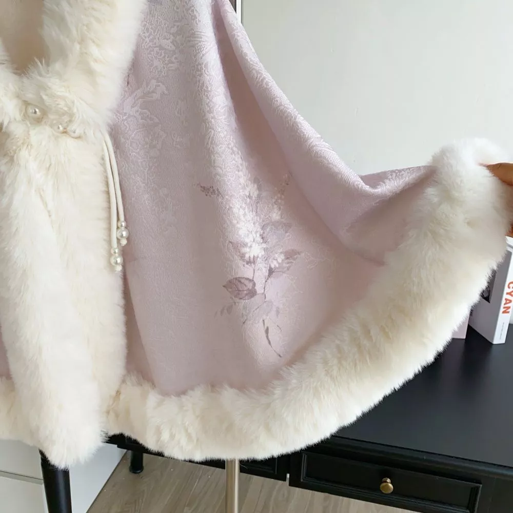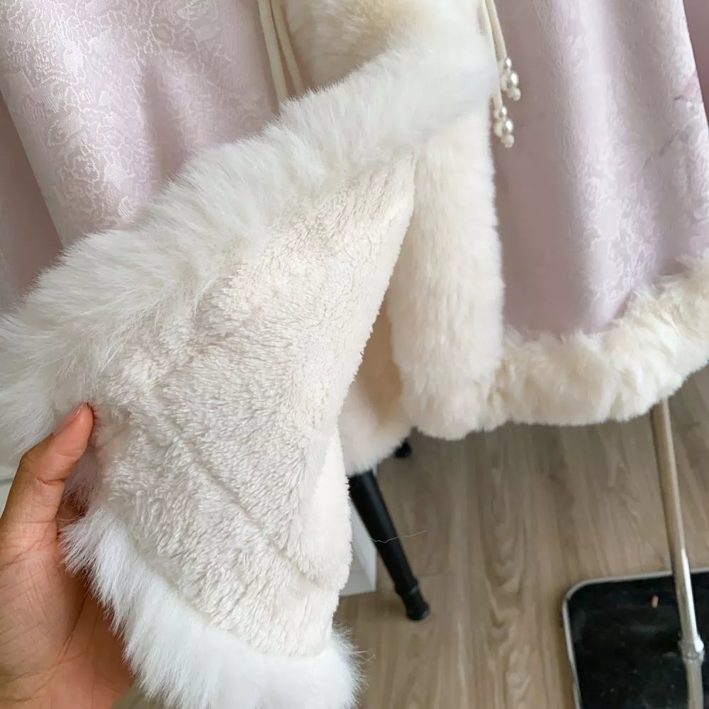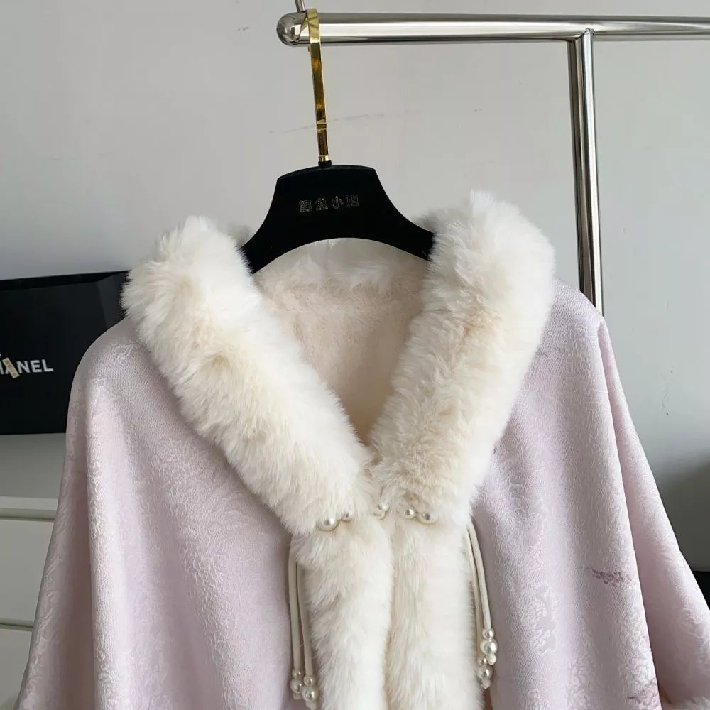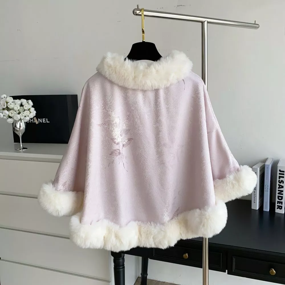 Una cappa invernale elegante, calda e raffinata, ideale per dare un tocco ricercato a qualsiasi outfit. Il taglio morbido avvolge senza appesantire, mentre il bordo in pelliccia sintetica avorio aggiunge volume e luminosità al profilo. La lavorazione jacquard tono su tono dona un effetto prezioso e discreto, perfetto per look femminili e sofisticati. I cordoncini decorativi con perle completano il design con un dettaglio delicato. Un capo versatile e scenografico, ideale per chi desidera un’estetica romantica e d’impatto nelle giornate fredde.