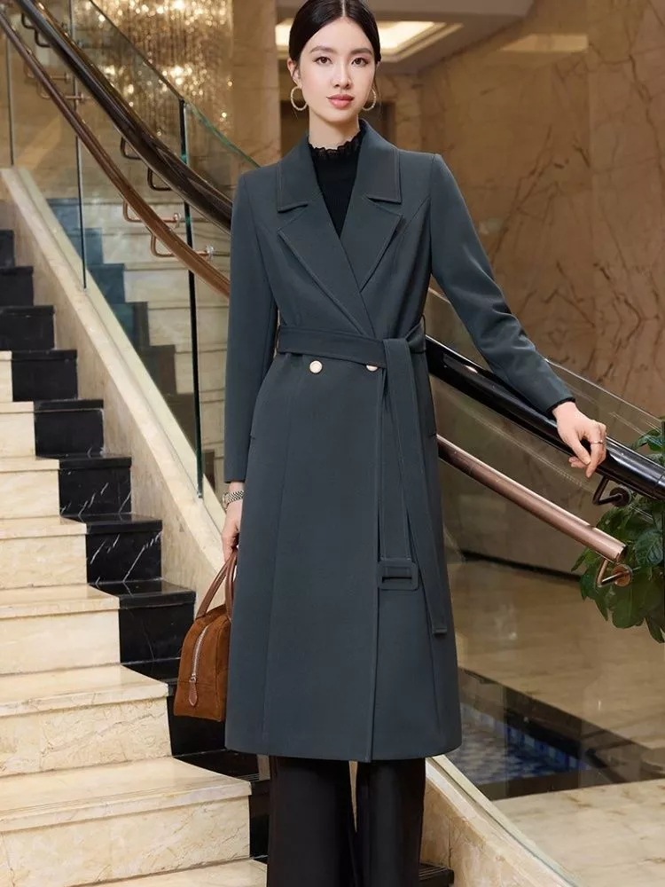 Cappotto Lungo Grigio Scuro Elegante Doppiopetto Cintura Look Moderno CF59564