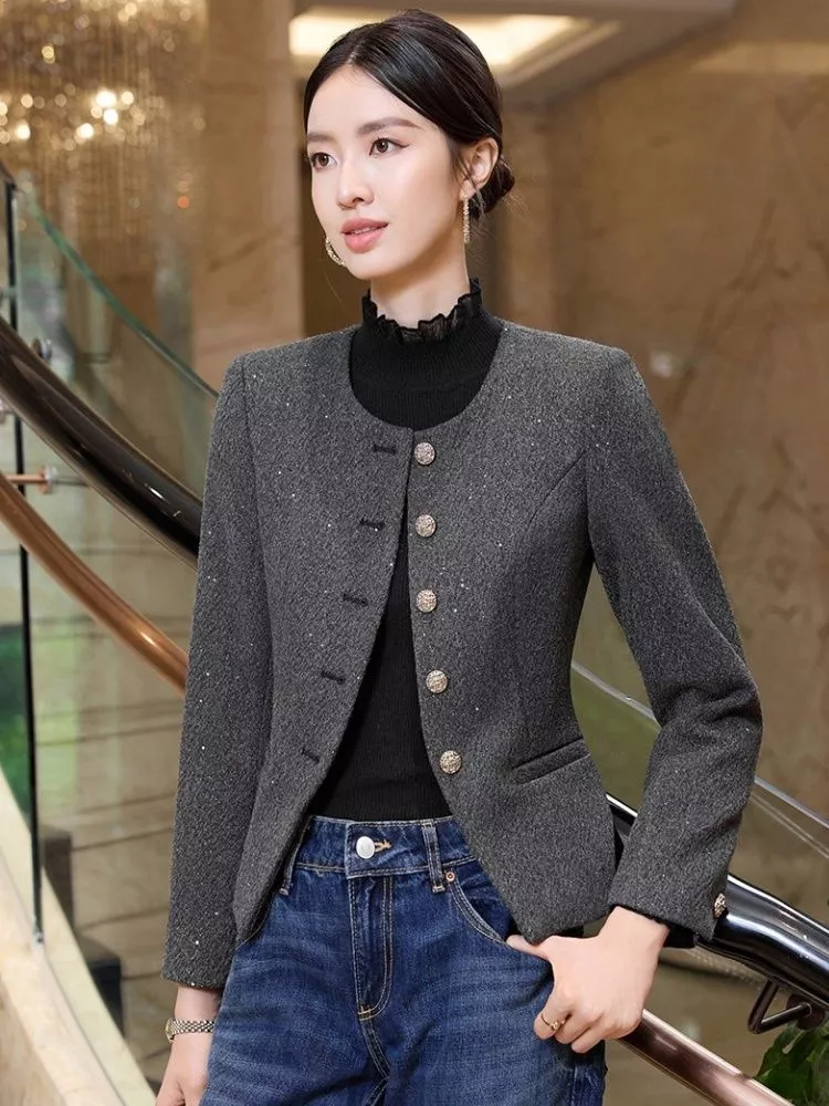 Giacca Grigia Elegante Bottoni Gioiello Stile Raffinato Donna Moderna CF59565