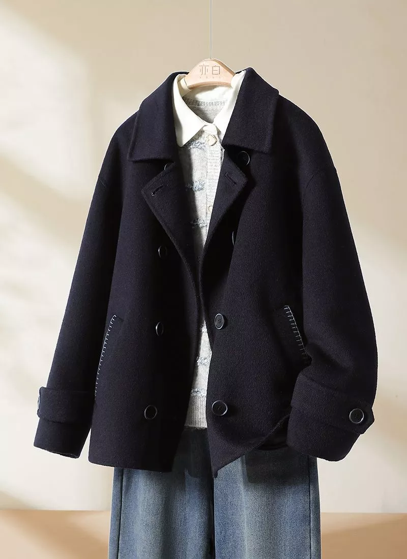 Cappotto Corto Doppiopetto Blu Navy Elegante Linea Morbida Outfit Donna CF59844