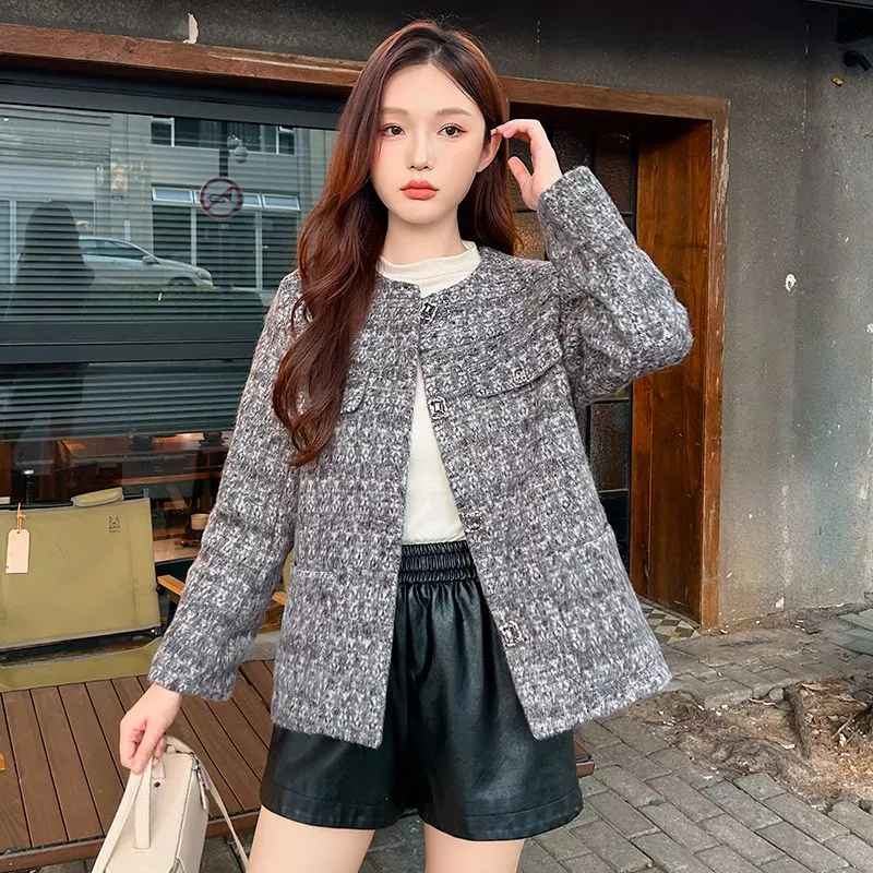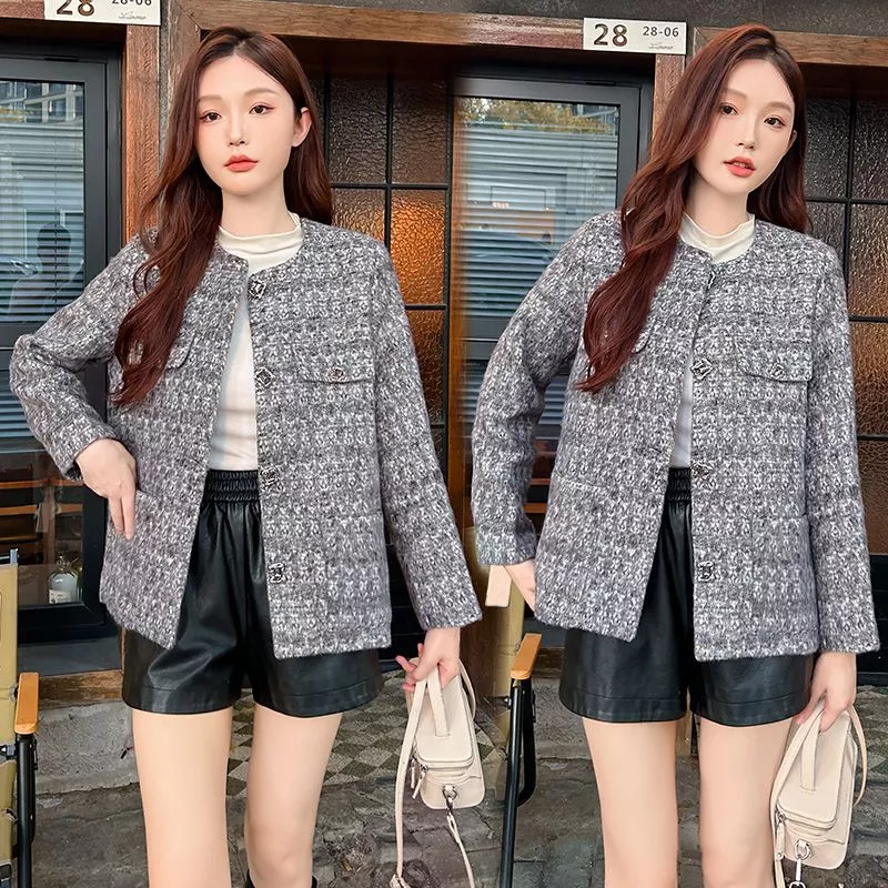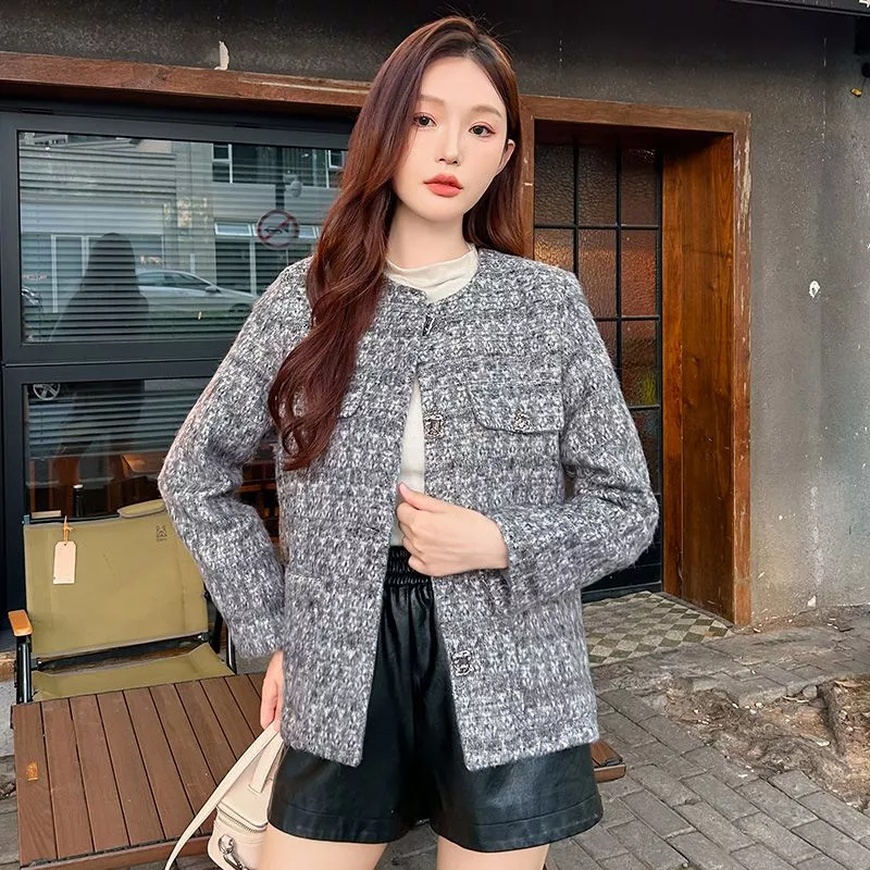 Cappotto Corto Grigio Mélange In Tessuto Strutturato Elegante Autunnale CF56902