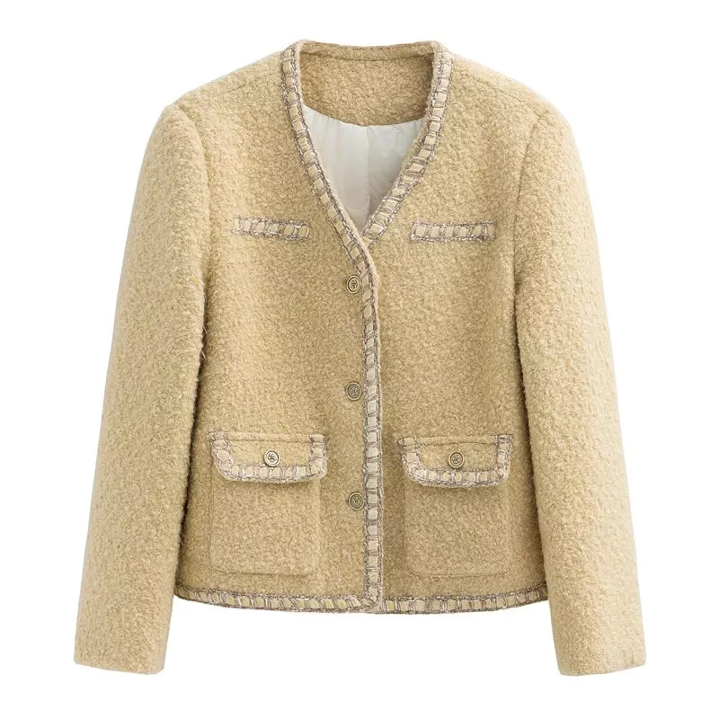 Cappotto Donna Beige Chiaro In Tweed Raffinato Con Profili E Tasche CF61911