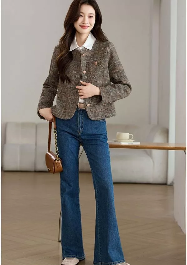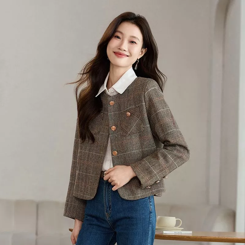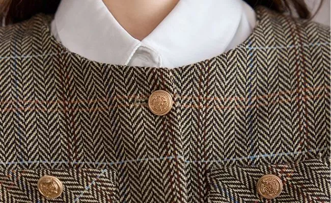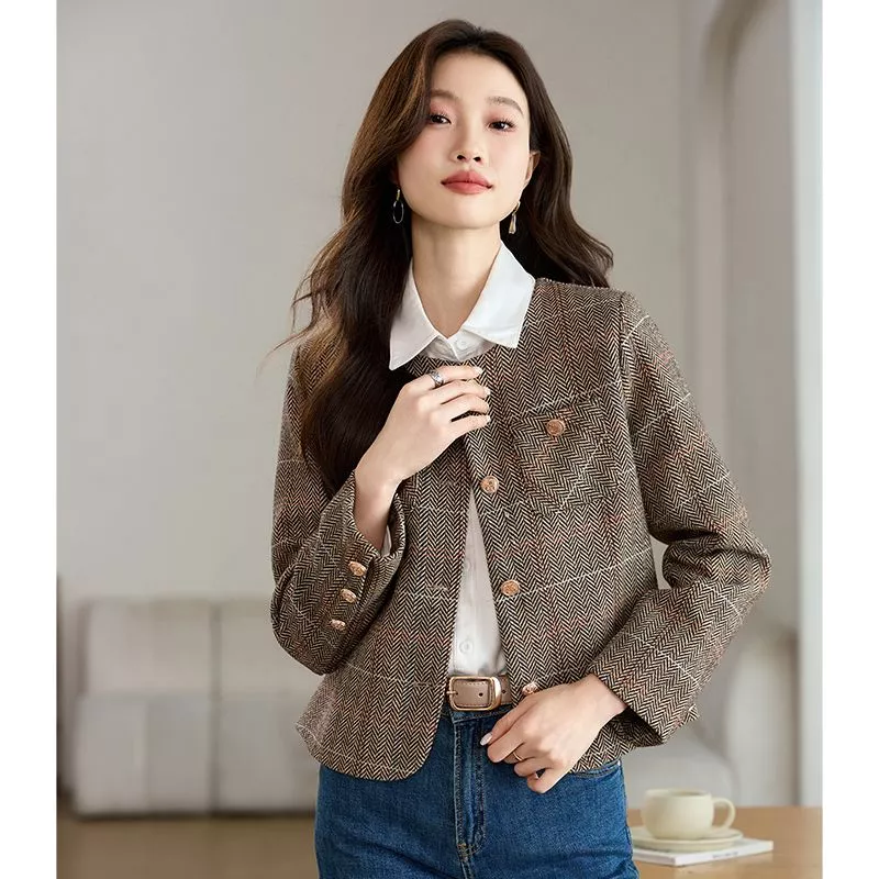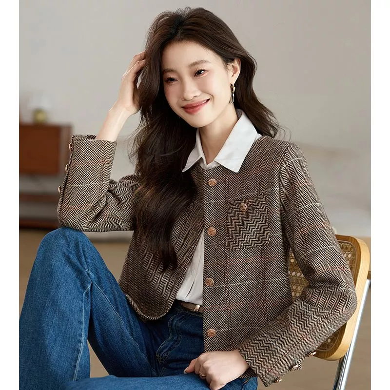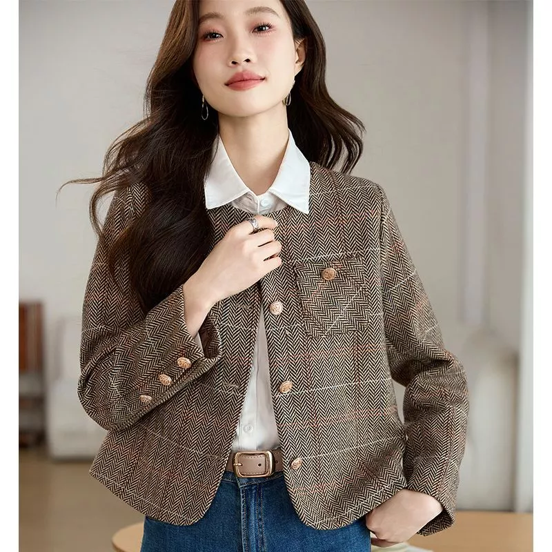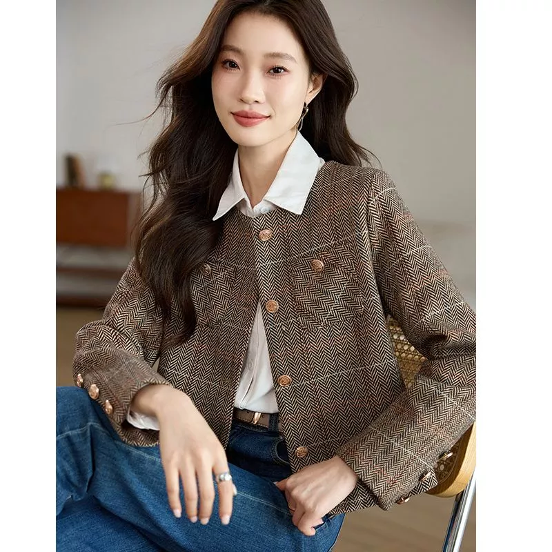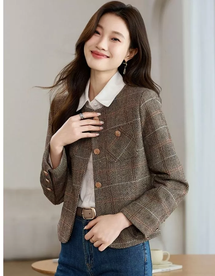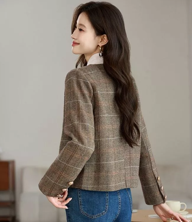 Cappotto Donna Giacca Corto Marrone Beige Tweed Elegante Slim Fit 30244