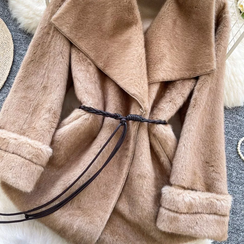 Cappotto Donna Kaki Effetto Peluche Con Collo A V E Cintura Taglio Ampio 62189