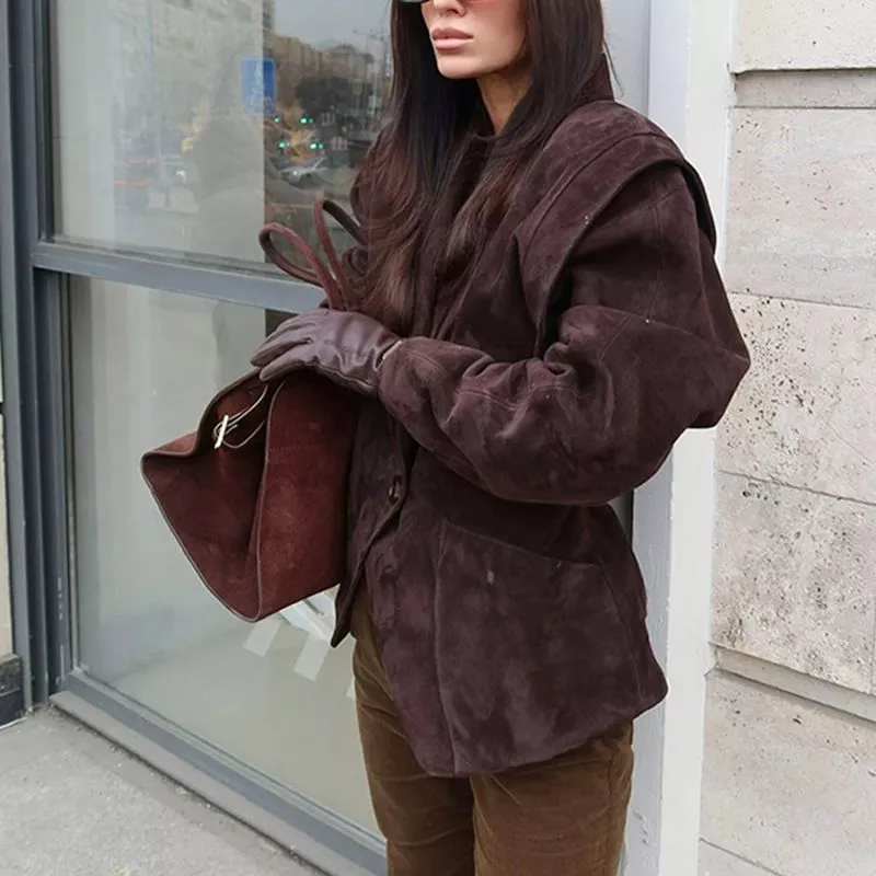 Cappotto elegante effetto scamosciato con spalle strutturate e chiusura a bottone singolo.