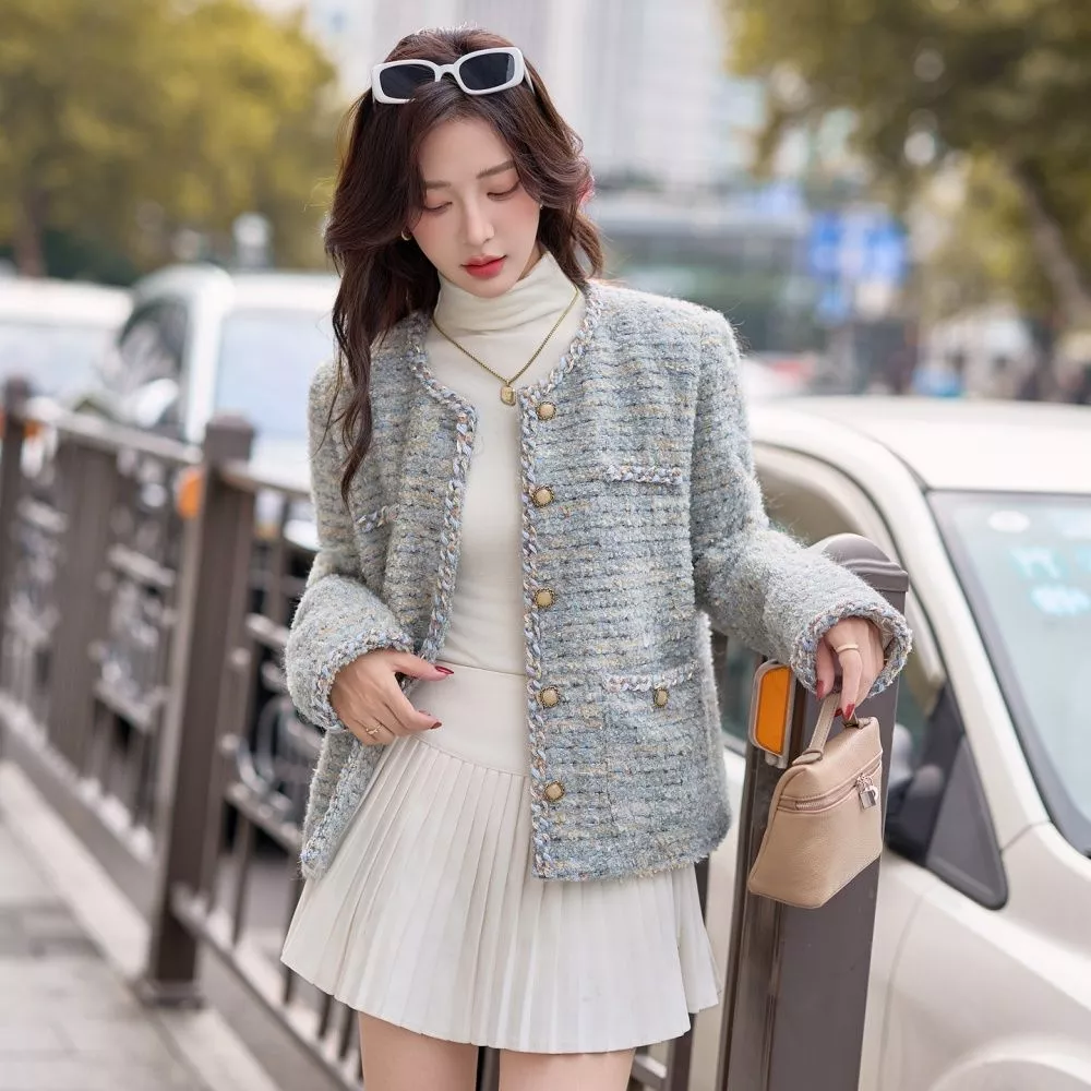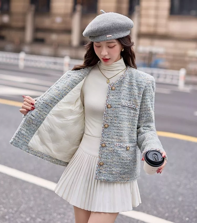 Cappotto Donna Tweed Azzurro Polvere Elegante Stile College Con Bottoni CF61914
