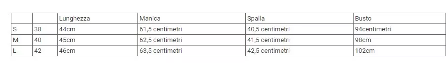 | S | 38 | 44cm | 61,5 centimetri | 40,5 centimetri | 94centimetri |