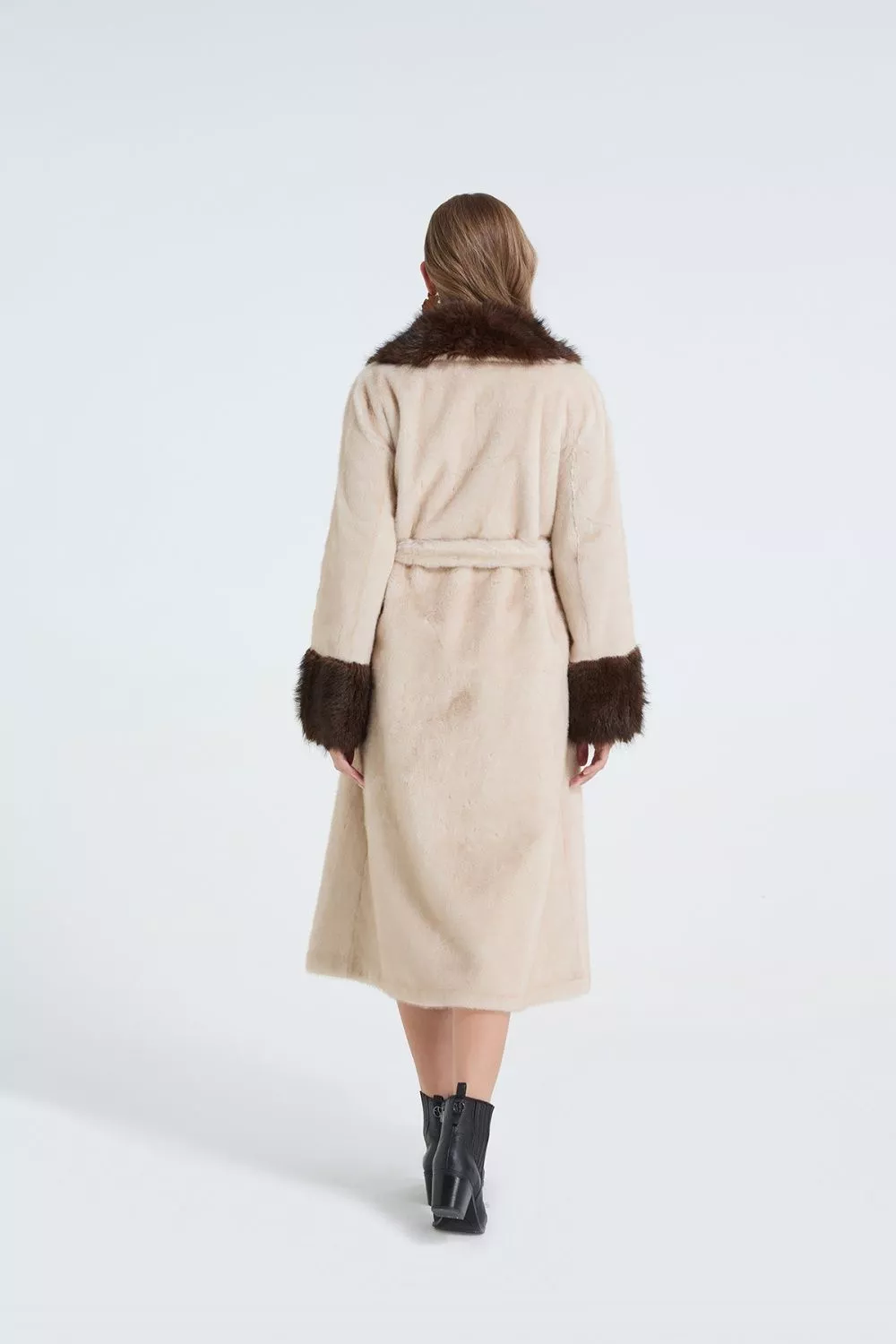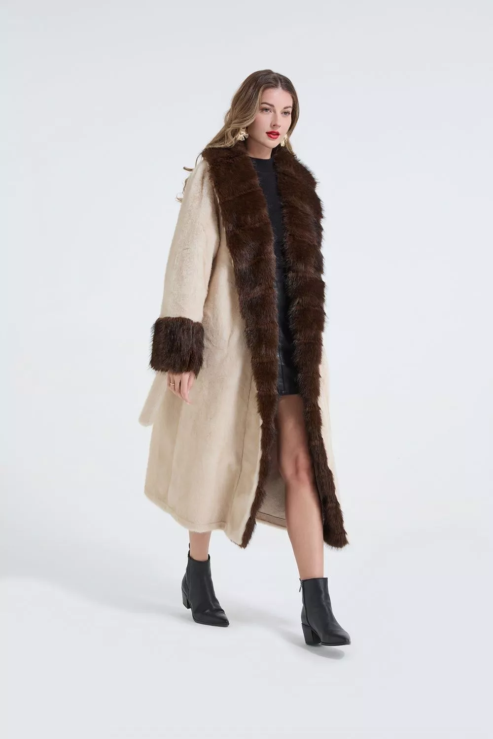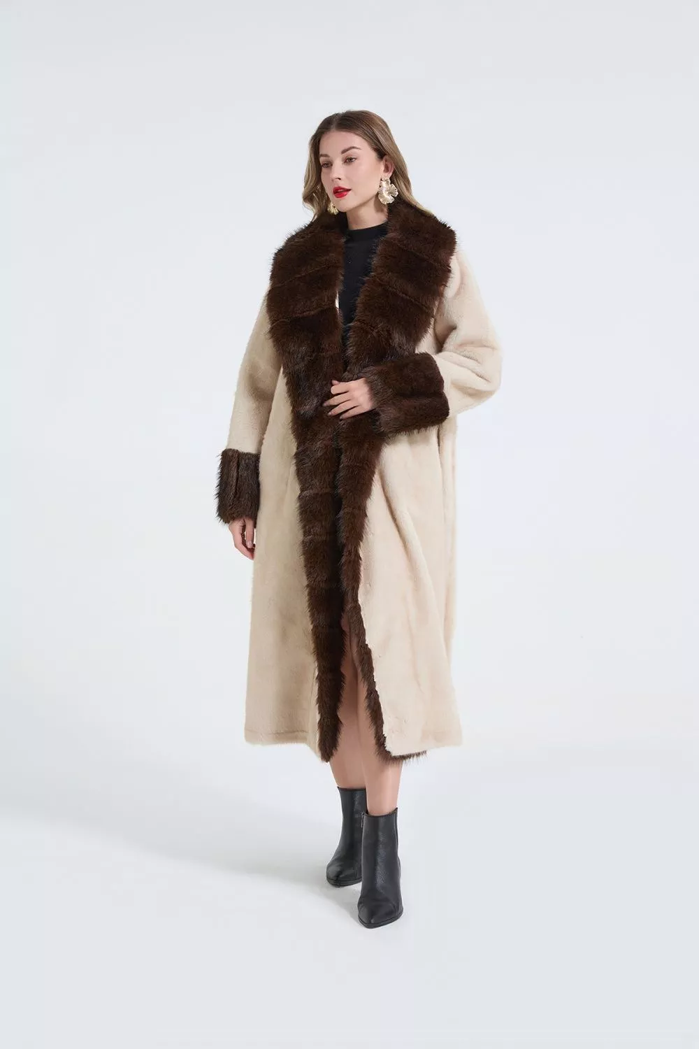 Cappotto lungo donna effetto pelliccia sintetica dal taglio elegante, impreziosito da collo ampio in pelliccia a contrasto e cintura coordinata in vita che definisce la silhouette. La lunghezza sotto il ginocchio e il volume avvolgente rendono il capo ideale per look raffinati, serali o da occasione speciale. Un outerwear di forte presenza scenica, pensato per chi cerca stile deciso e comfort visivo.