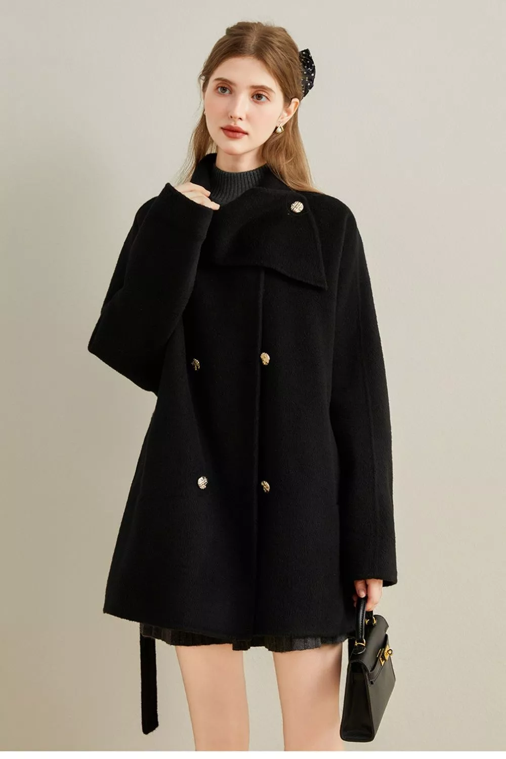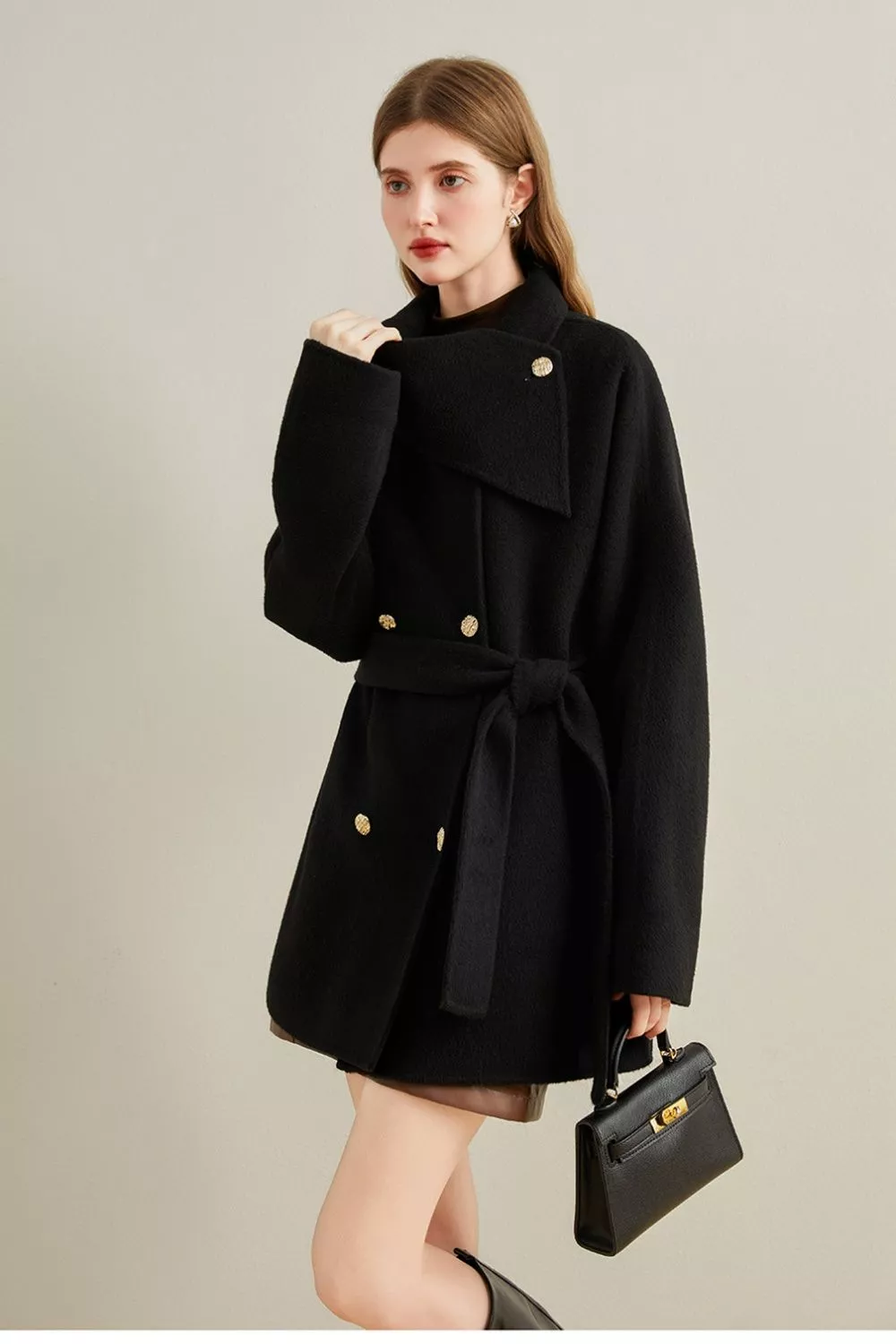 Cappotto corto in tessuto tipo lana sintetica, con chiusura doppiopetto e cintura coordinata in vita.