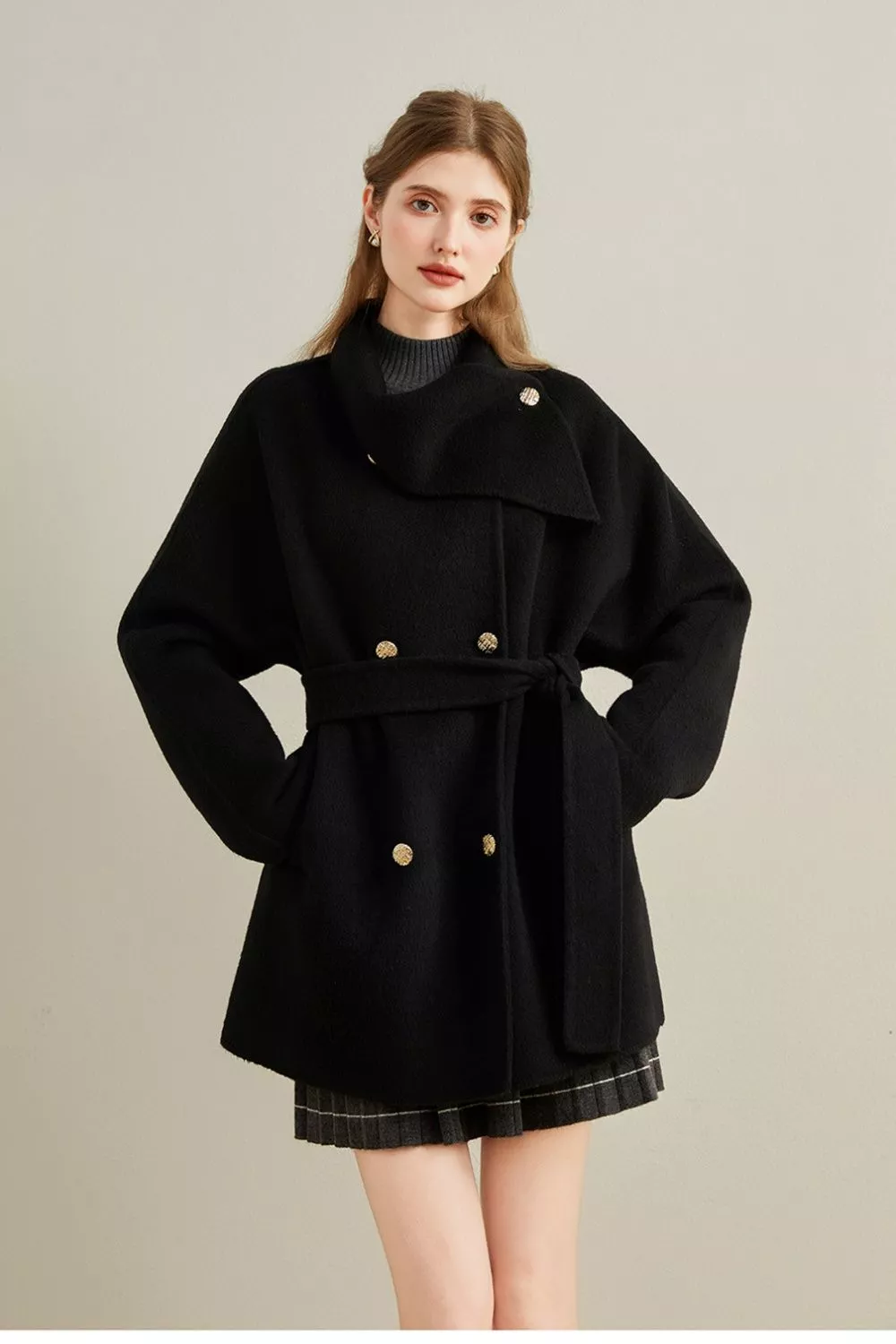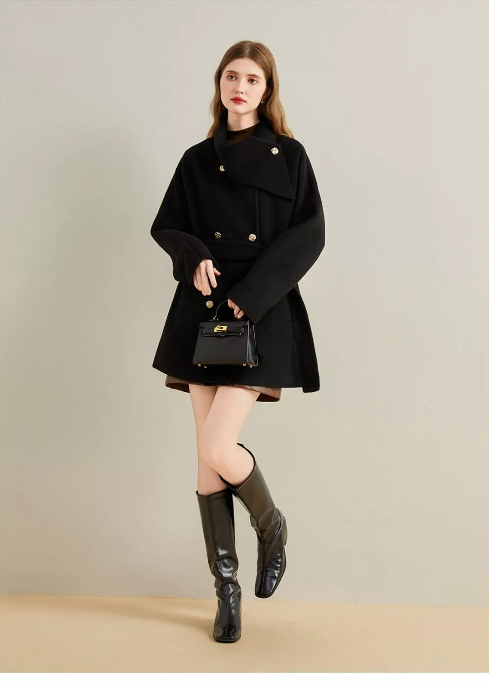 Cappotto Nero Corto In Lana Sintetica Con Collo Asimmetrico E Cintura CF56930
