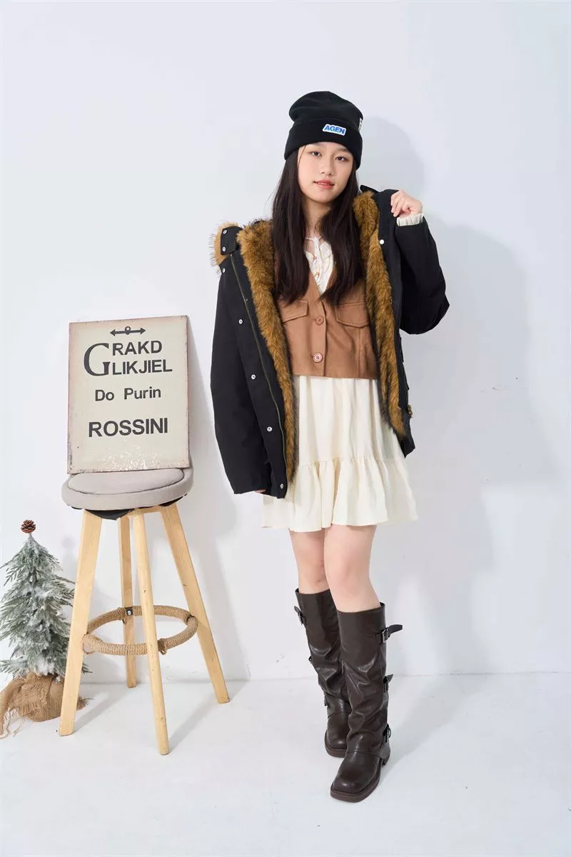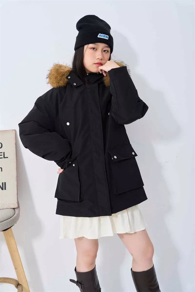 Il modello presenta un cappuccio con bordo in morbida eco pelliccia, ampie tasche frontali con patta e chiusura con zip e bottoni automatici.