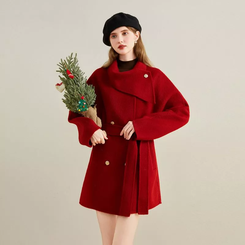 Cappotto corto in tessuto tipo lana sintetica, con chiusura doppiopetto e cintura coordinata in vita.