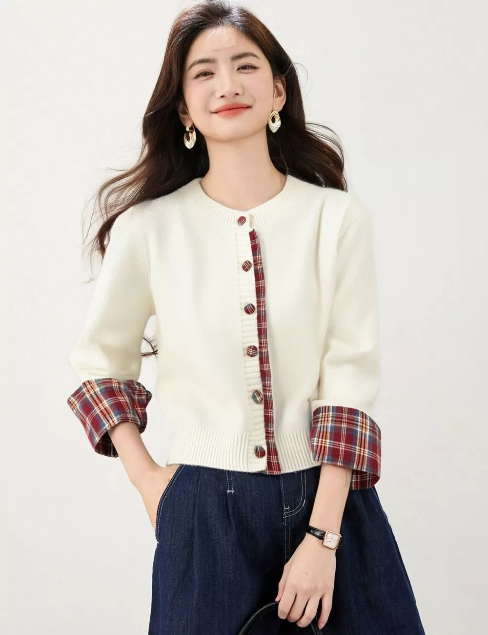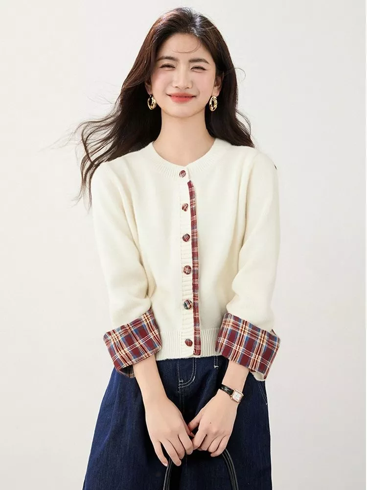 Cardigan da donna con collo tondo e dettagli scozzesi a contrasto su bottoni e risvolti delle maniche, che donano un tocco originale e ricercato. Realizzato in morbida maglia a vestibilità comoda, è un capo casual chic perfetto per la mezza stagione. Disponibile in rosso e albicocca, si abbina facilmente a jeans, gonne o pantaloni, completando l'outfit con uno stile moderno e raffinato.