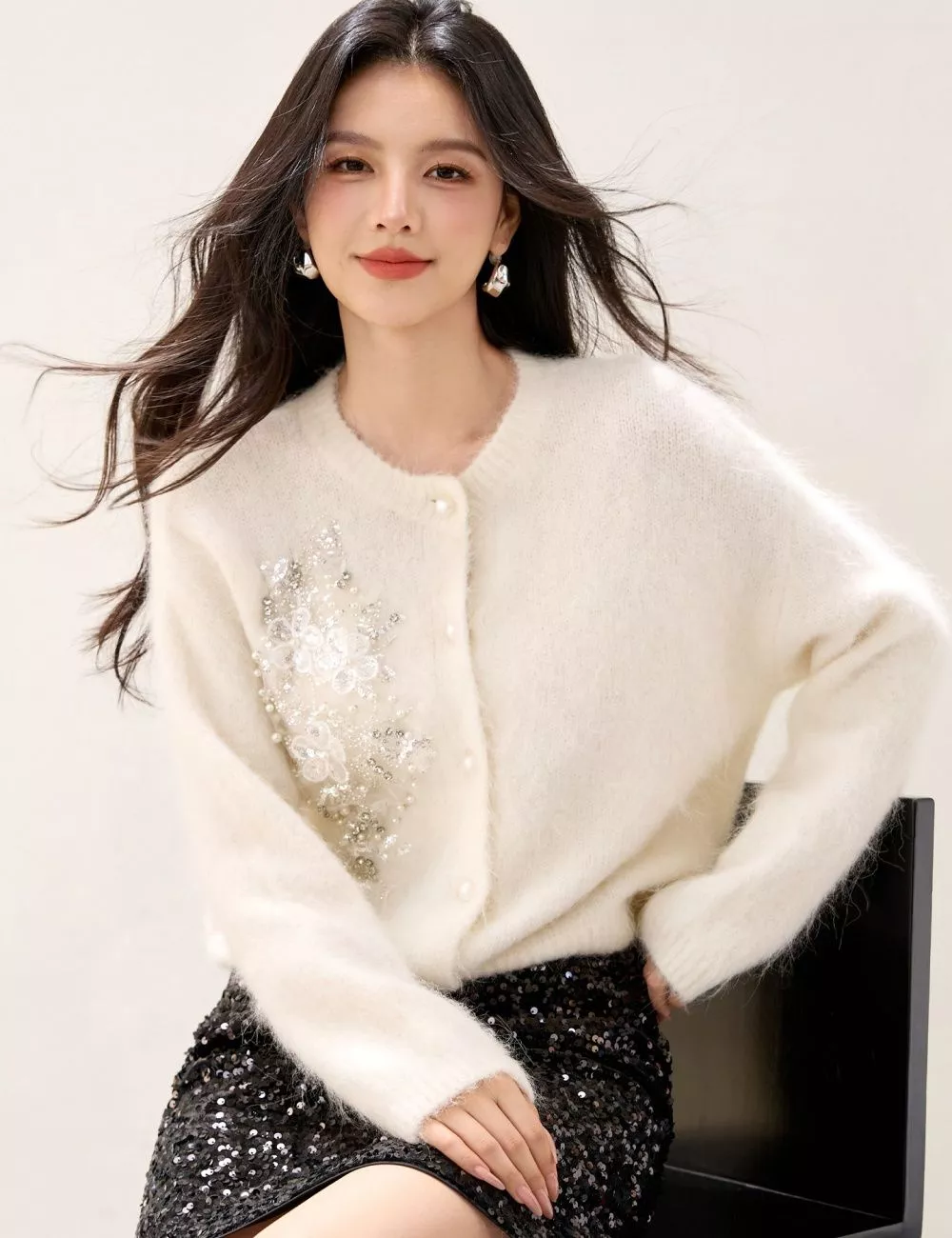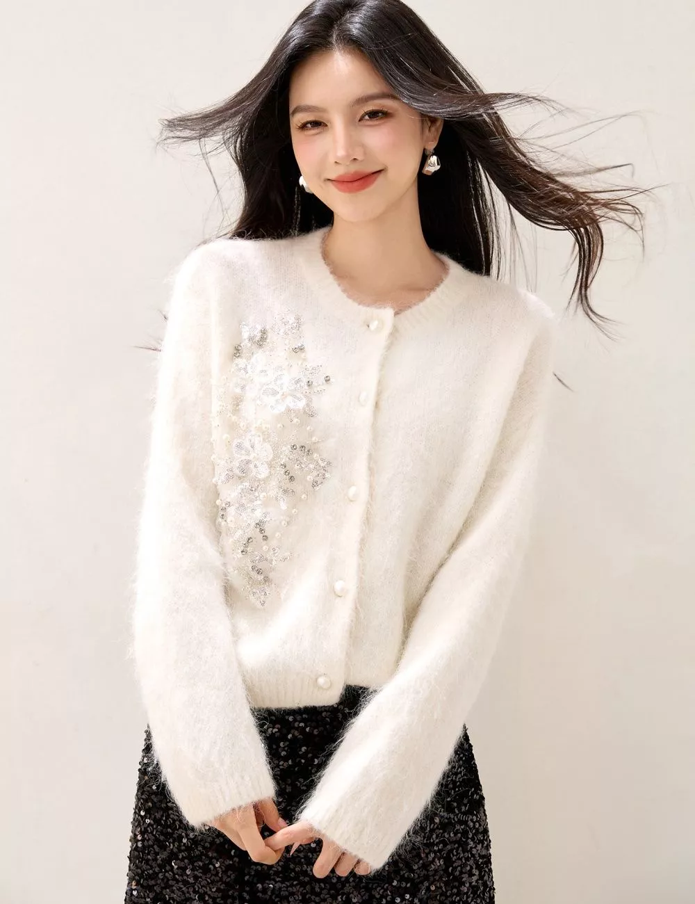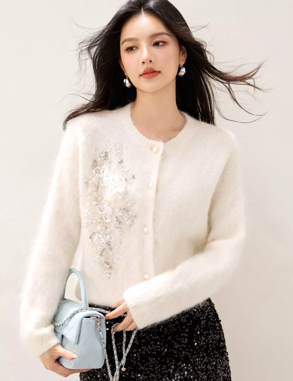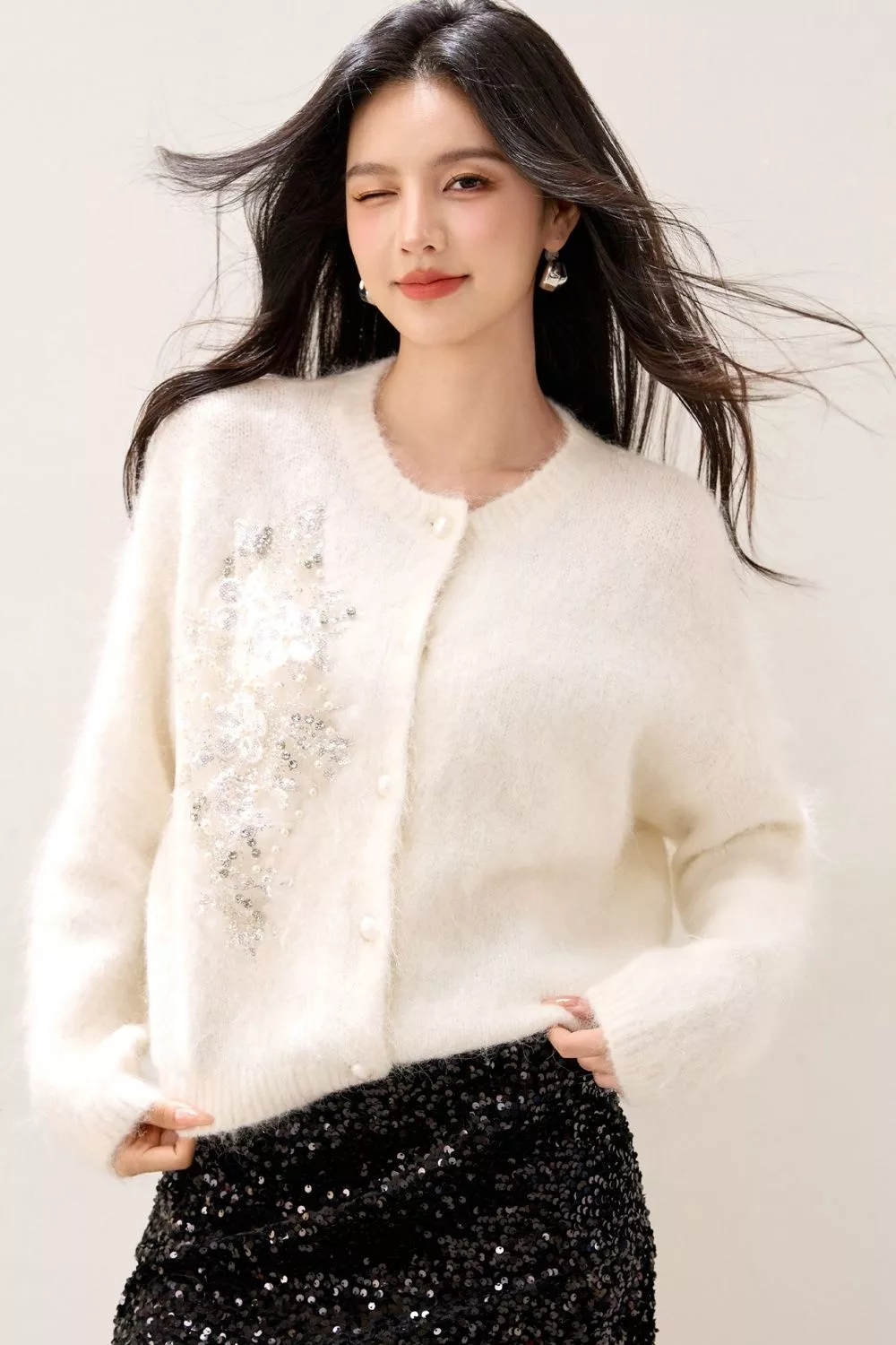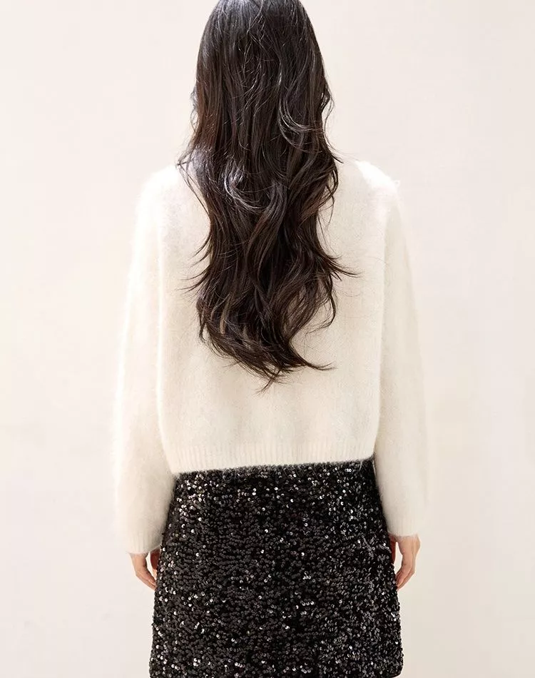 Il tessuto effetto mohair regala una sensazione di calore e morbidezza, mentre la lavorazione sottile con dettagli brillanti valorizza la figura in modo delicato e raffinato.
