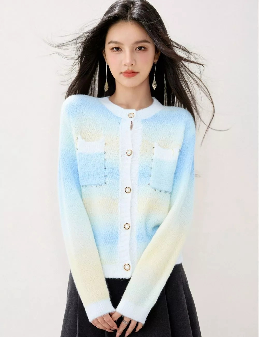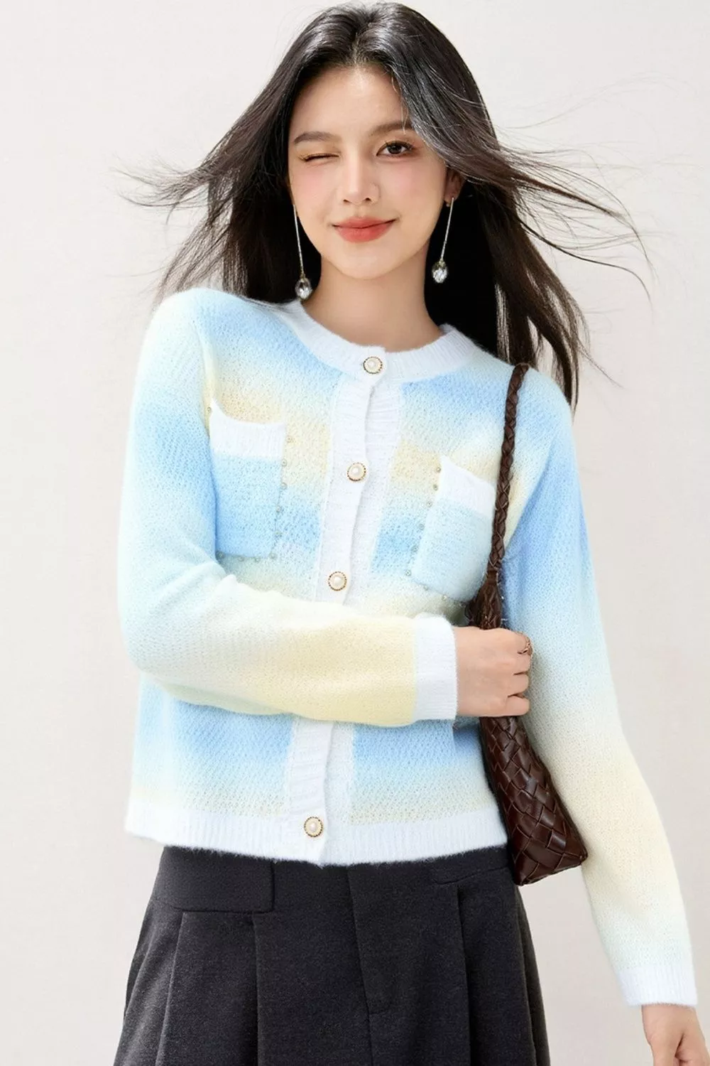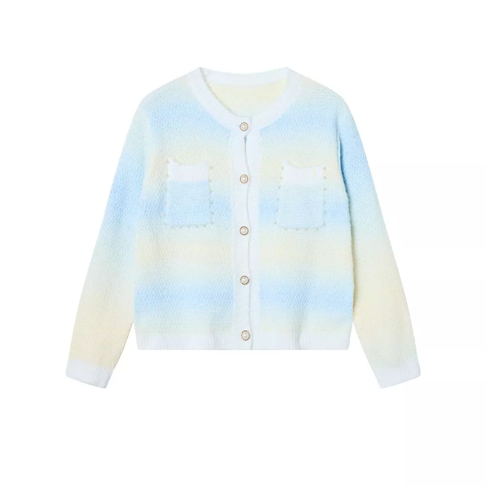 Cardigan raffinato in maglia morbida effetto sfumato nei toni del blu e dell'azzurro pastello. Il design è arricchito da tasche frontali con piccoli dettagli decorativi e bottoni gioiello tono su tono che donano un tocco luminoso e curato.