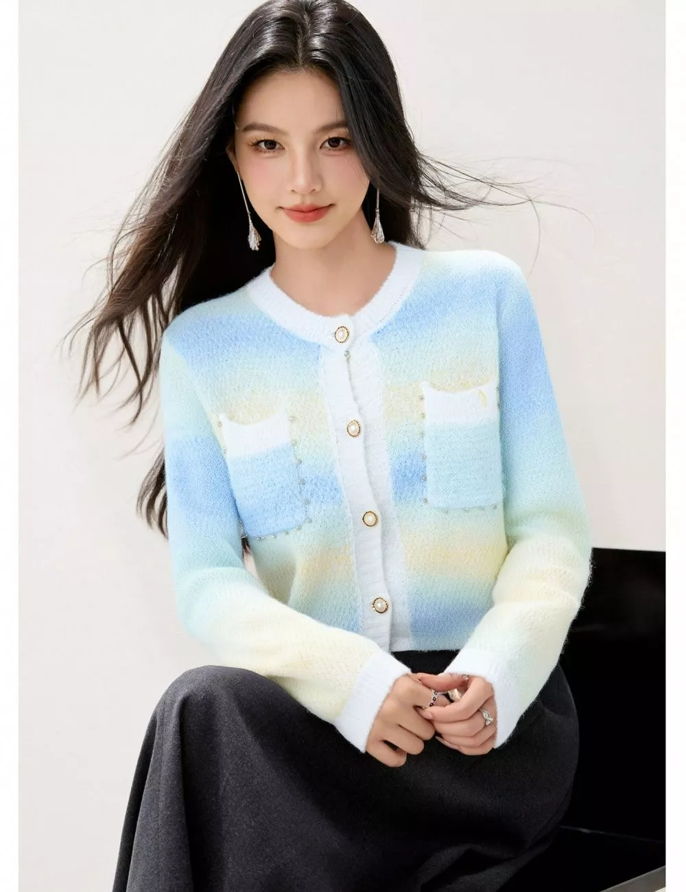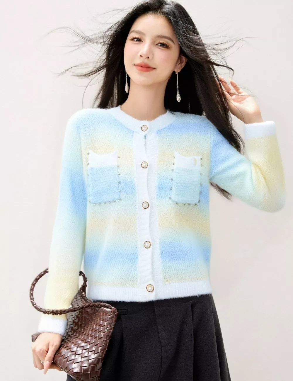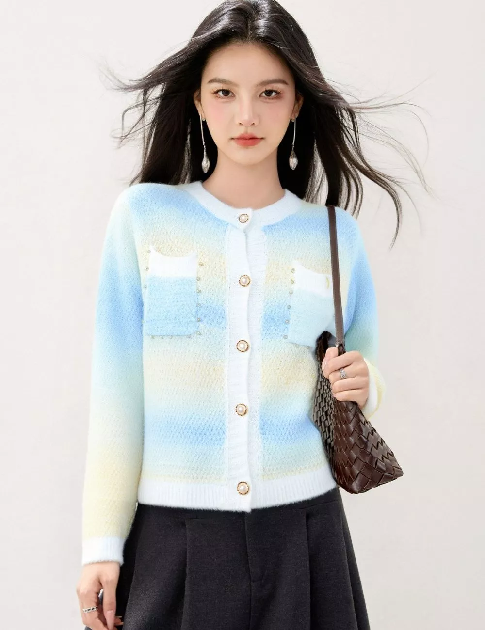 Cardigan raffinato in maglia morbida effetto sfumato nei toni del blu e dell'azzurro pastello. Il design è arricchito da tasche frontali con piccoli dettagli decorativi e bottoni gioiello tono su tono che donano un tocco luminoso e curato.