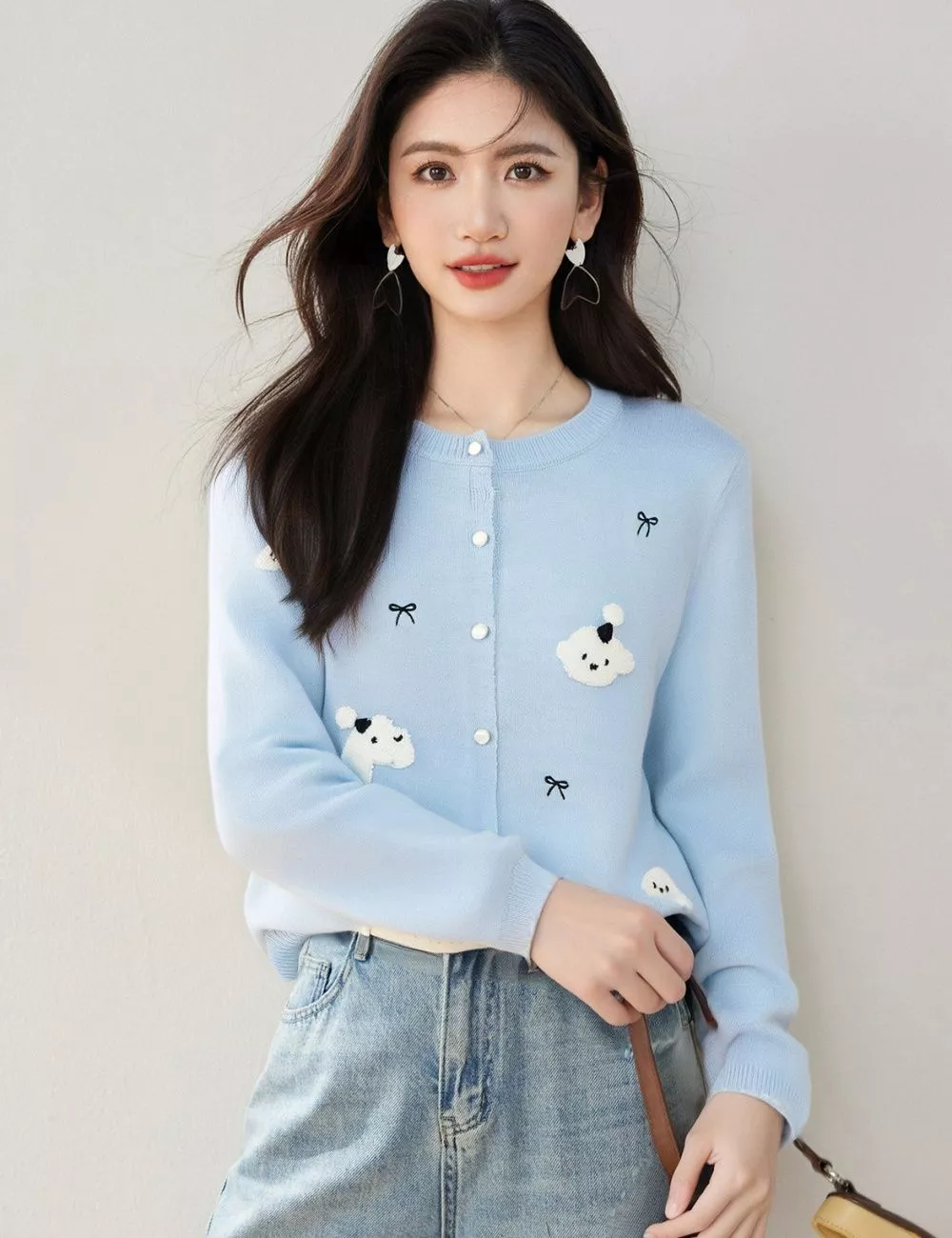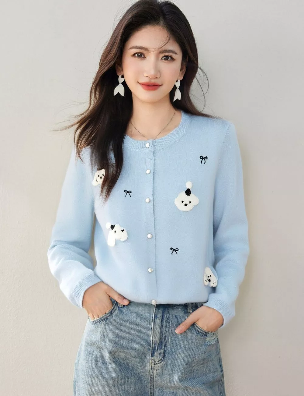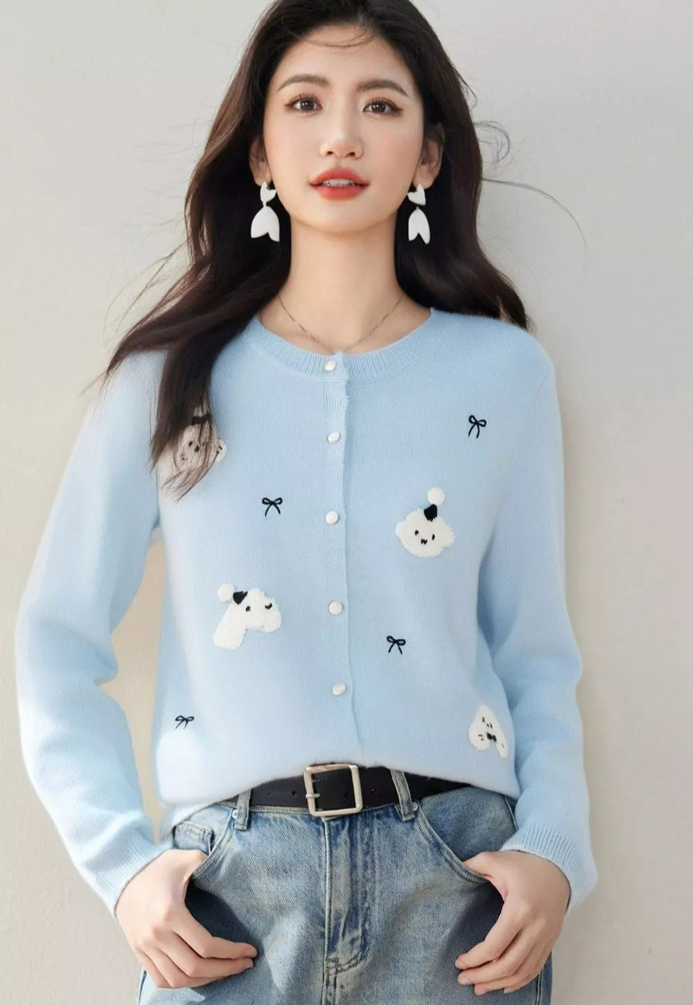 Cardigan donna in morbida maglia azzurra, caratterizzato da simpatici ricami a forma di cagnolini e piccoli fiocchi neri che donano un tocco giovane e giocoso. I bottoni perlati frontali aggiungono un dettaglio femminile e raffinato, rendendolo perfetto da indossare su jeans o gonne per look casual e di tendenza. Un capo versatile e allegro, ideale per la mezza stagione e per completare l’outfit con originalità e comfort.