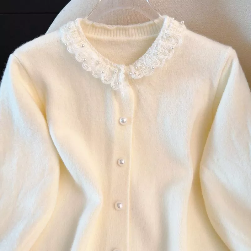 Cardigan donna dallo stile delicato e raffinato, realizzato in maglia morbida con struttura uniforme e vestibilità confortevole. Il design è impreziosito da un colletto in pizzo decorativo che incornicia il collo con eleganza, ripreso anche sul fondo manica per un effetto armonioso e curato. La chiusura frontale con bottoni effetto perla valorizza ulteriormente il capo, rendendolo adatto sia a look quotidiani ordinati sia ad abbinamenti più eleganti. Linee pulite e proporzioni equilibrate lo rendono un cardigan versatile e facile da indossare.