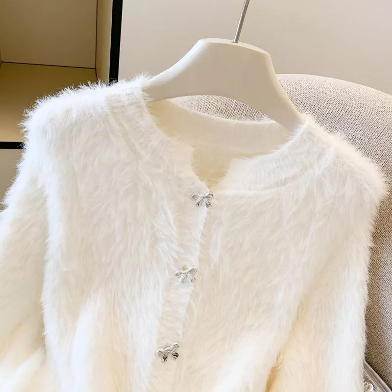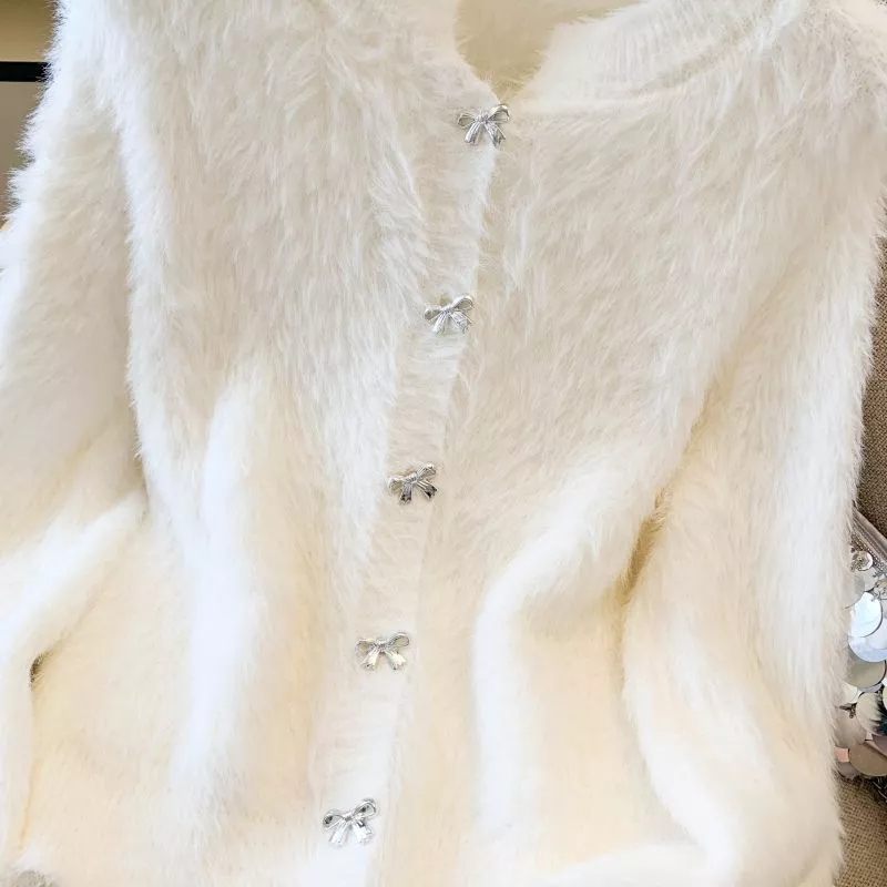 Cardigan Donna Bianco Morbido Peloso Con Fiocchi Elegante Look Caldo CF58187