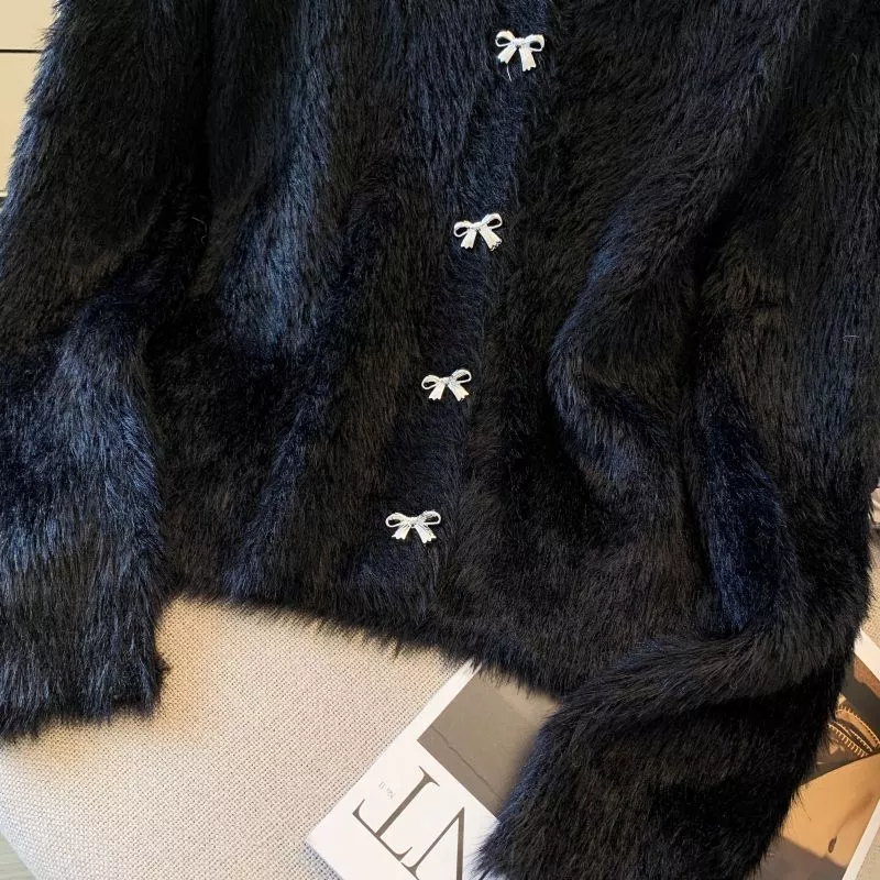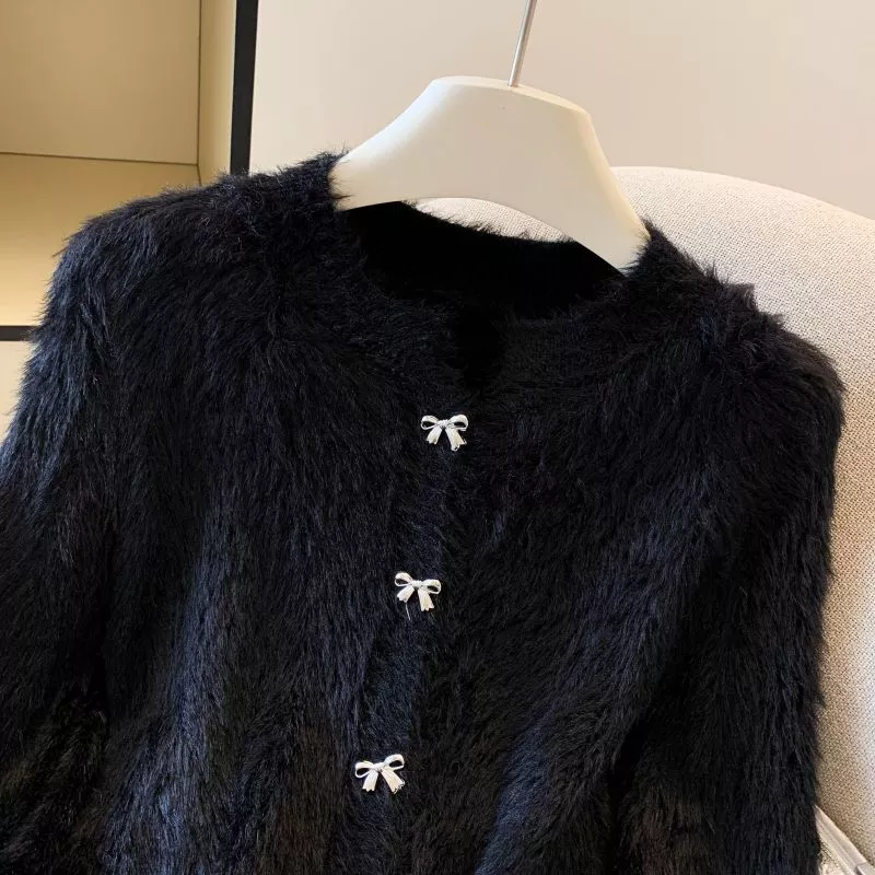 Cardigan Donna Nero Morbido Peloso Con Fiocchi Elegante Look Caldo CF58187