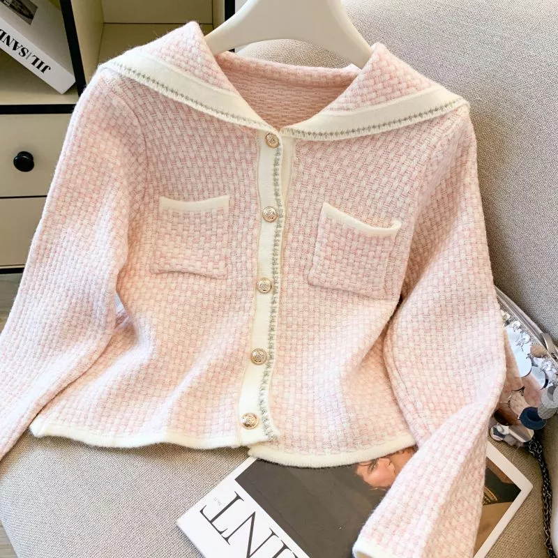 Cardigan Donna Rosa Con Colletto A Contrasto Bottoni Elegante Morbido CF58293