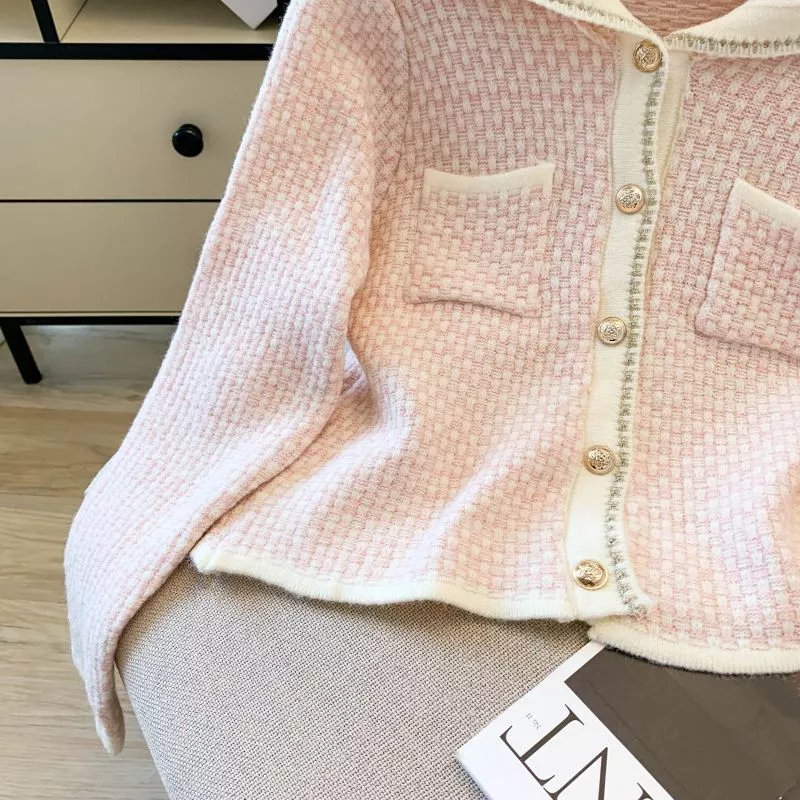 Cardigan donna elegante con colletto a contrasto, caratterizzato da una lavorazione morbida e intrecciata che dona un aspetto raffinato e luminoso. La linea leggermente svasata e la chiusura frontale con bottoni rendono il capo pratico e femminile, mentre le taschine decorative aggiungono un tocco di dolcezza e stile.