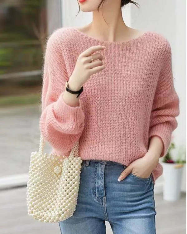 Cardigan Maglia Pullover Donna Morbido Maglione Rosa Scollo a Barca 06812