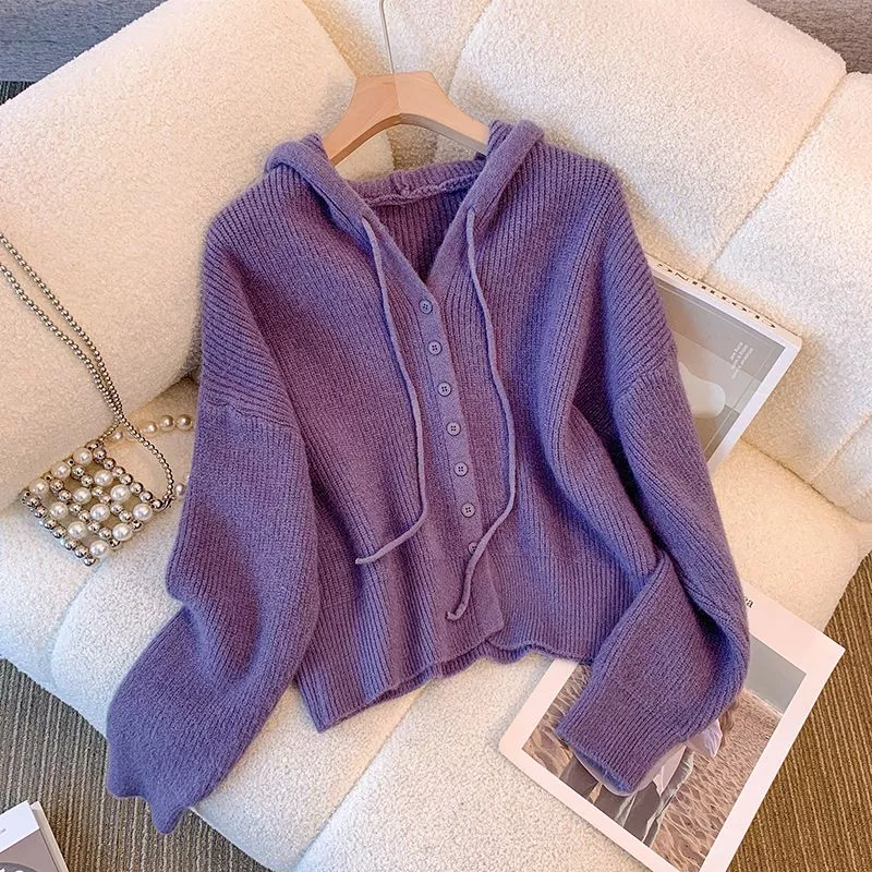 Cardigan Maglia Pullover Donna Morbido Maglione Viola Cappuccio 88085