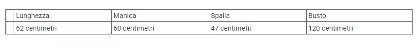 | Lunghezza | Manica | Spalla | Busto | |