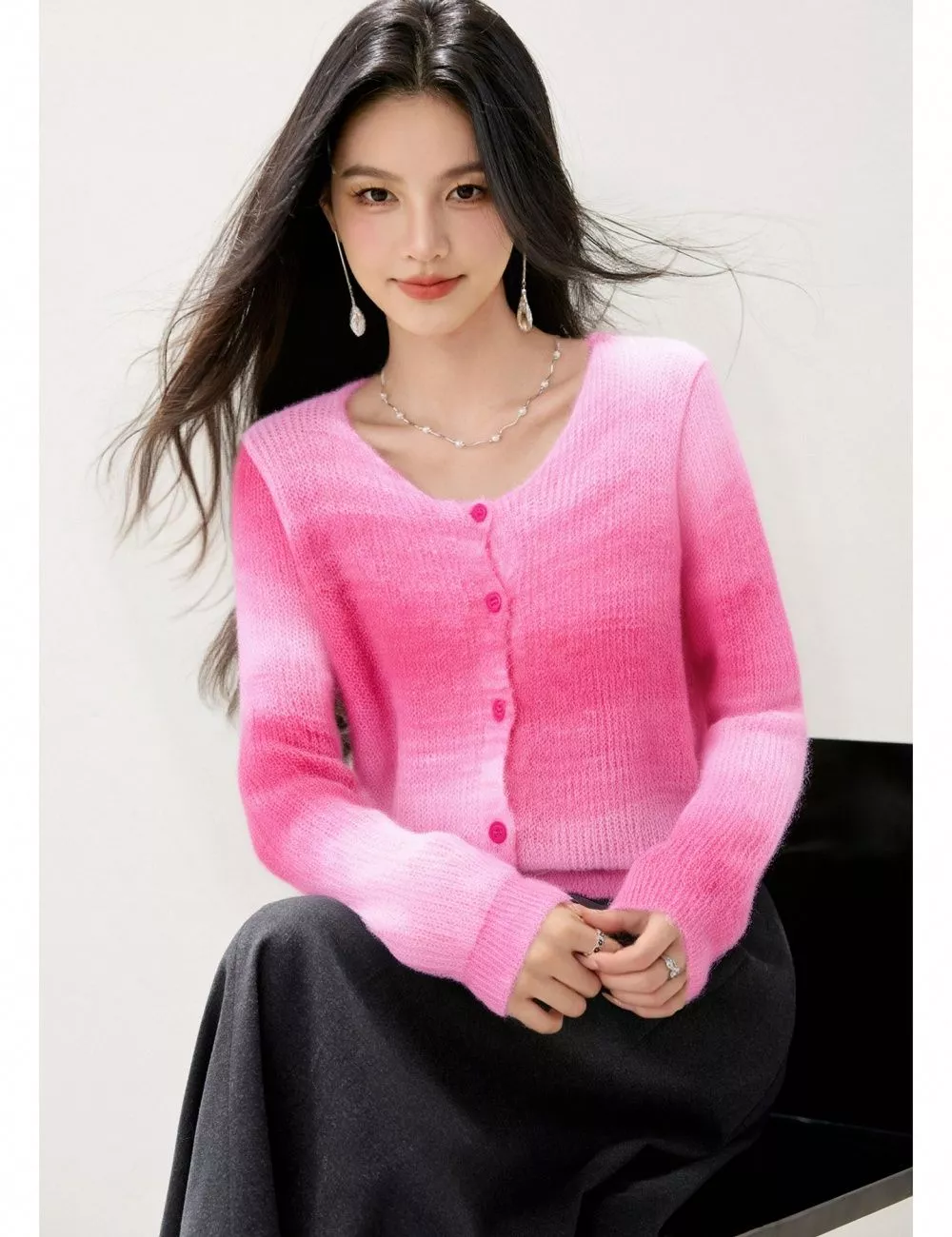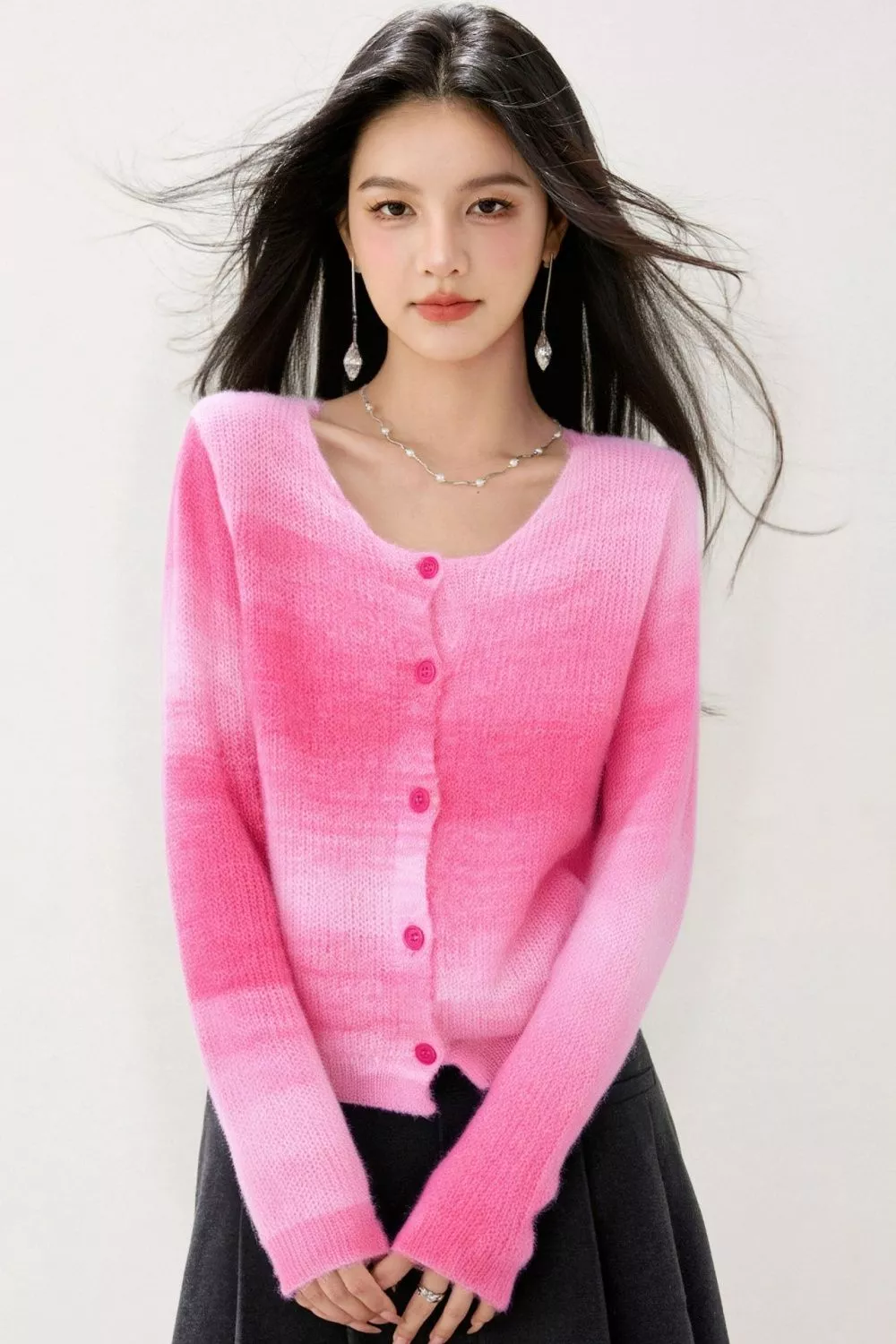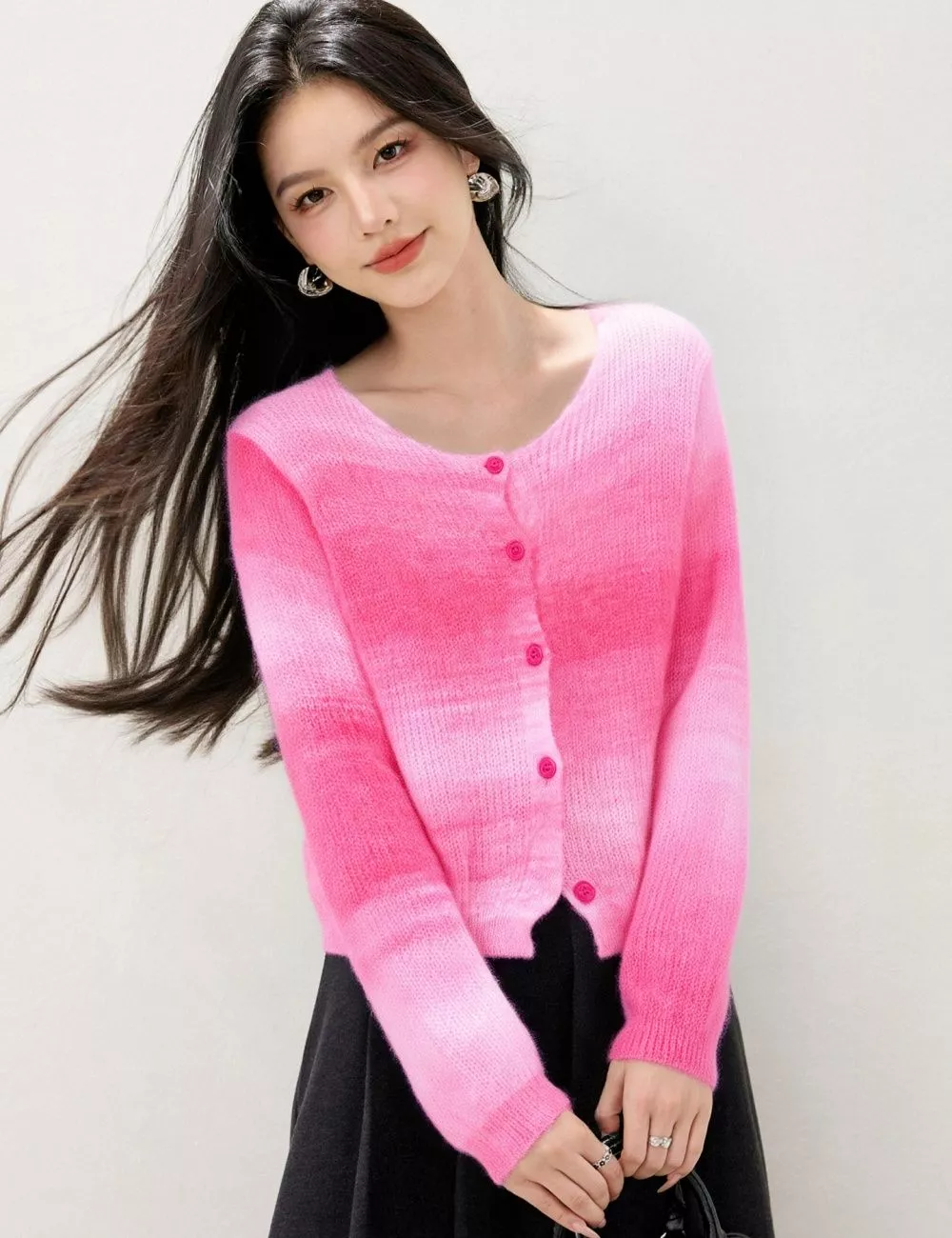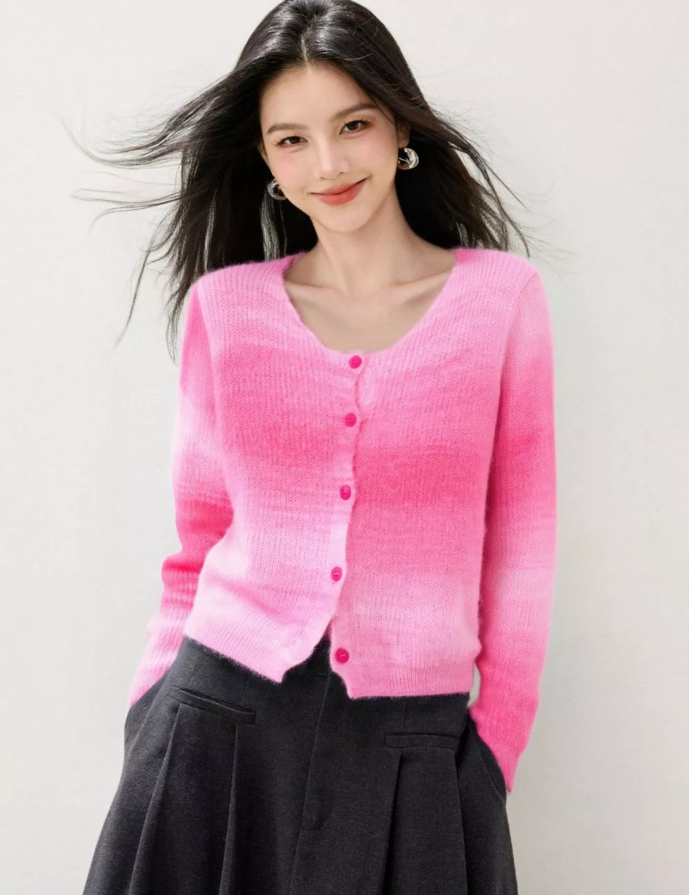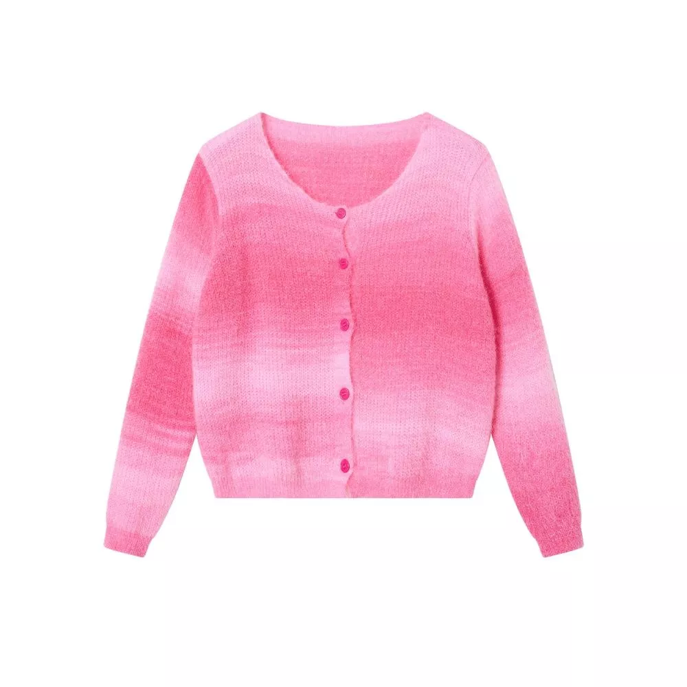 Cardigan delicato e femminile in maglia morbida effetto sfumato nei toni del rosa. Il taglio corto con scollo a V e bottoni tono su tono valorizza la silhouette, mentre la texture soffice offre comfort e calore.