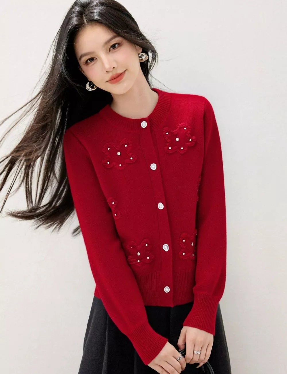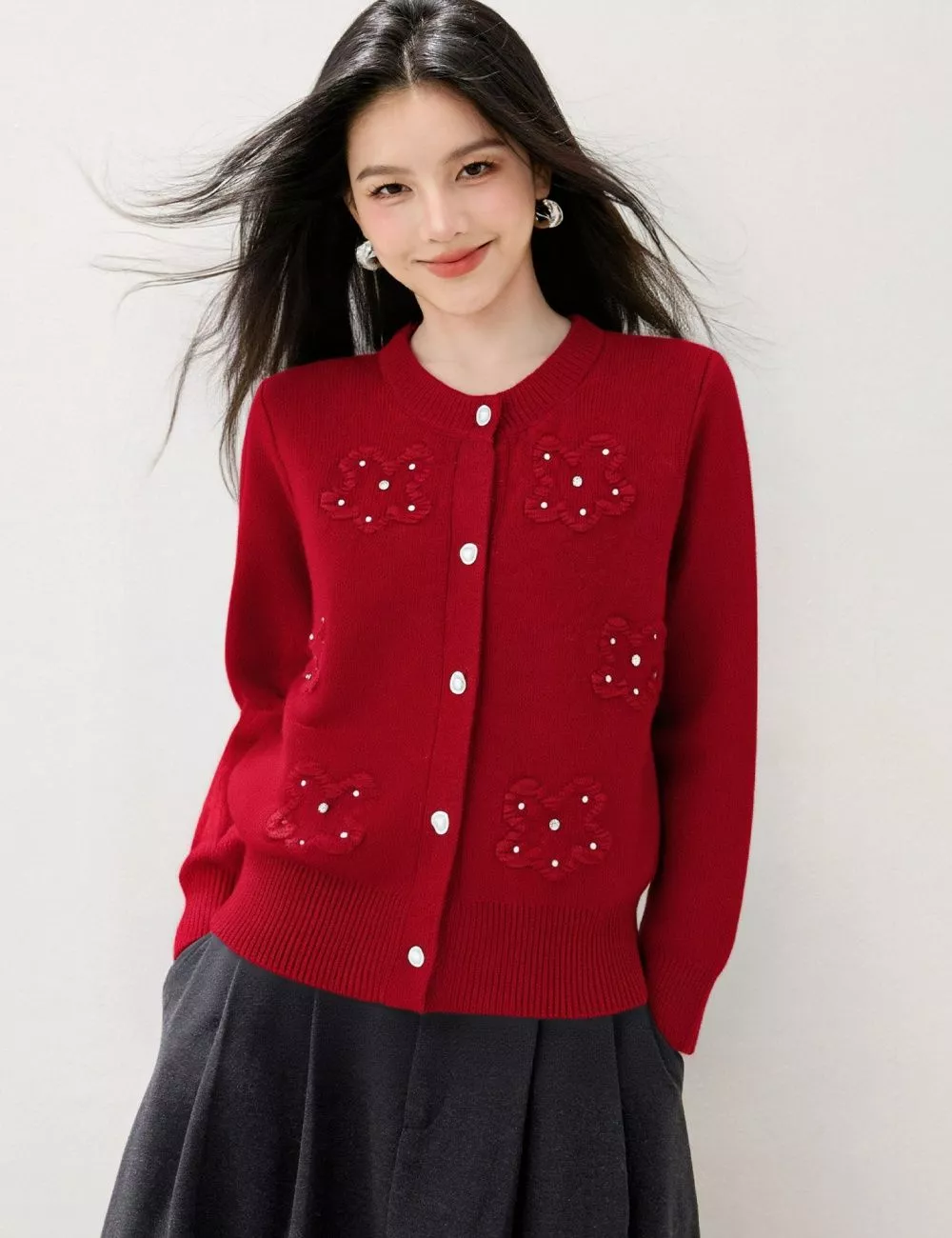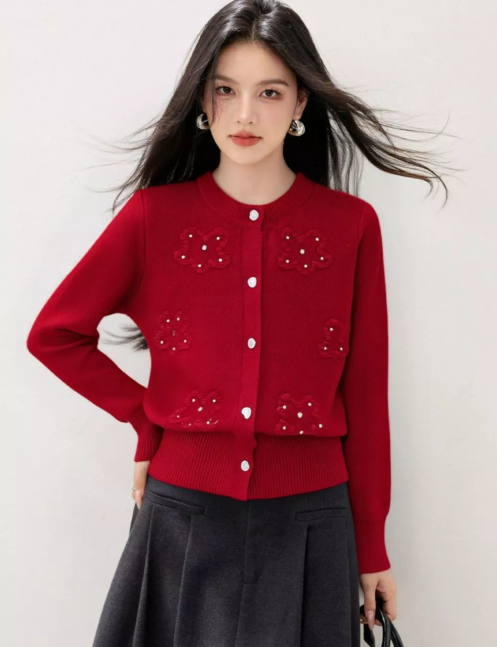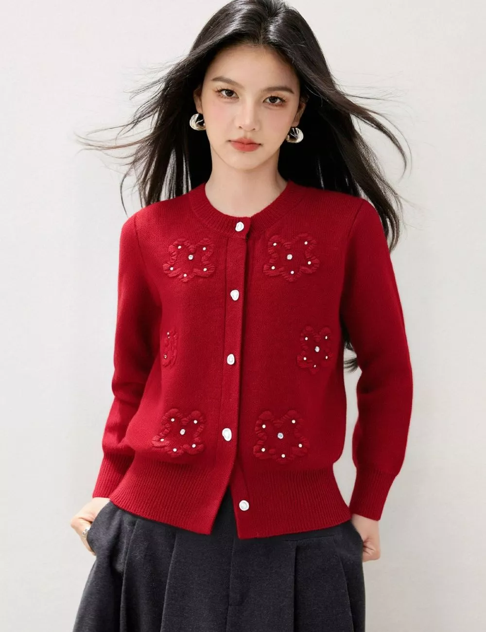 Cardigan raffinato e romantico in maglia morbida rossa, impreziosito da fiori ricamati con piccole perline che donano luce e femminilità al look.