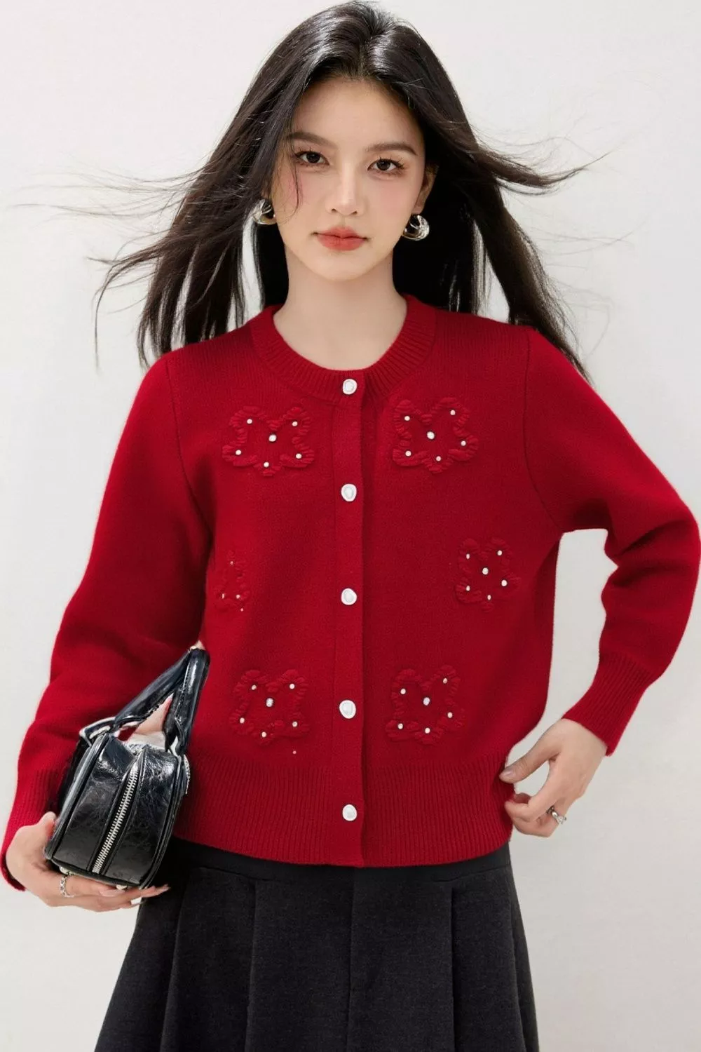 Cardigan Rosso Con Fiori Ricamati E Perline In Maglia Elegante Donna CF56258