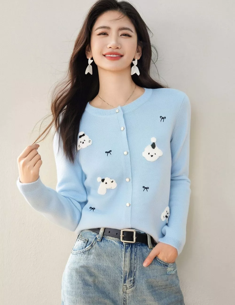 Cardigan Donna Azzurro Ricamato i Bottoni Perlati Maglia Morbida CF52605