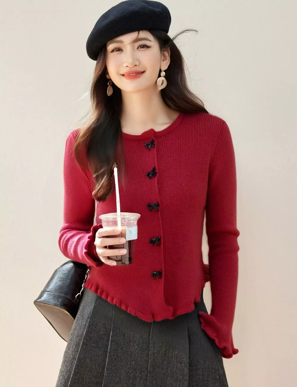 Cardigan Rosso Maniche Lunghe Bottoni Fiocchetto Maglia Elegante Casual CF52606