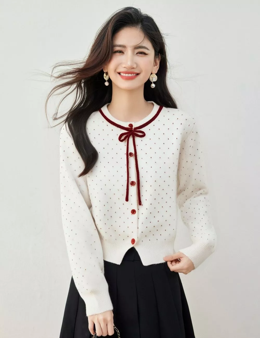 Cardigan Bianco Jacquard Cuori Rossi Fiocco Elegante Maglia Romantica CF52608