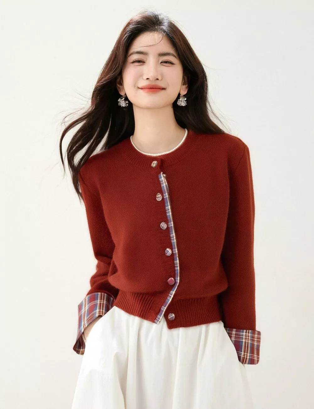 Cardigan Donna Rosso Dettagli Scozzesi A Contrasto Maglia Casual Chic CF52609